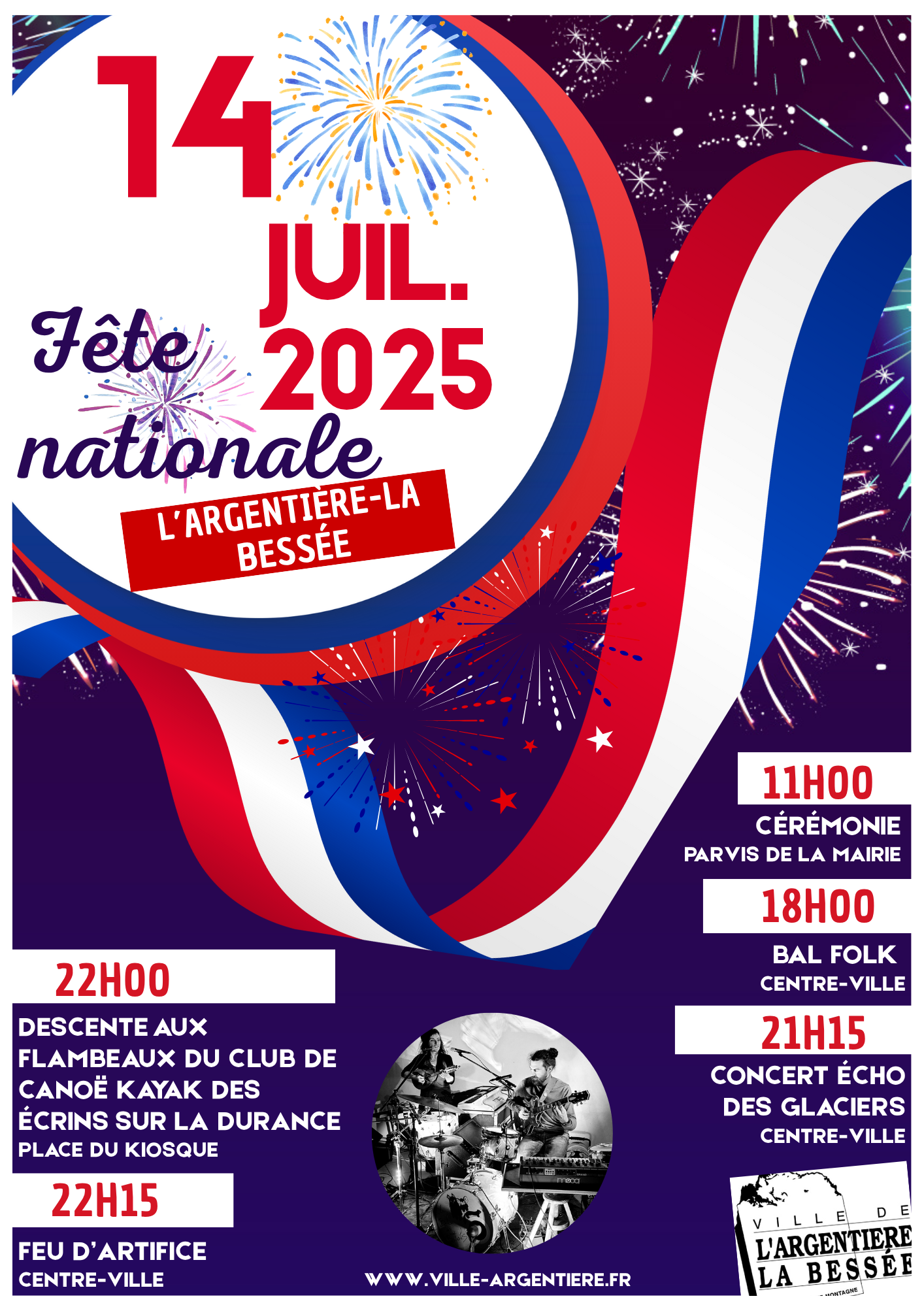 11h: cérémonie commémorative, départ devant la mairie en compagnie de l’harmonie de l’Écho des Glaciers, des anciens combattants, du Souvenirs Français, des porte-drapeaux et de la gendarmerie, jusqu’au Monument aux Morts. Un apéritif vous sera ensuite servi sur le parvis de la mairie. A partir de 14h: concours de pétanque à L’Ice Rock. Inscription sur place. De 18h à 21h: “LE BAL DES BESTIOLES”: 18h à 19h30: atelier initiation aux danses: valses, scottish, cercle, chapelloise, gavotte, andro etc. Les petits sont fortement invités à danser avec les plus grands! 19h30 à 21h: concert/bal: lorsque fusionnent guitare électrique, synthétiseurs, percussions, mandoline, voix, pour délivrer un Concert/Bal néo trad, teinté de rock progressif et de musique électronique. 21h15: concert de l’Écho des Glaciers sous le kiosque. 22h: descente aux flambeaux du club de canoë kayak des Écrins sur la Durance. À observer place du kiosque. 22h15: grand feu d’artifice, centre-ville. De 22h30 à 1h30: « DJ SIDNEY BOP » proposé par le bar-tabac “La Durance”, le restaurant “Le Kiosque”, et l’hôtel-restaurant “La Glaizette”, place du kiosque.