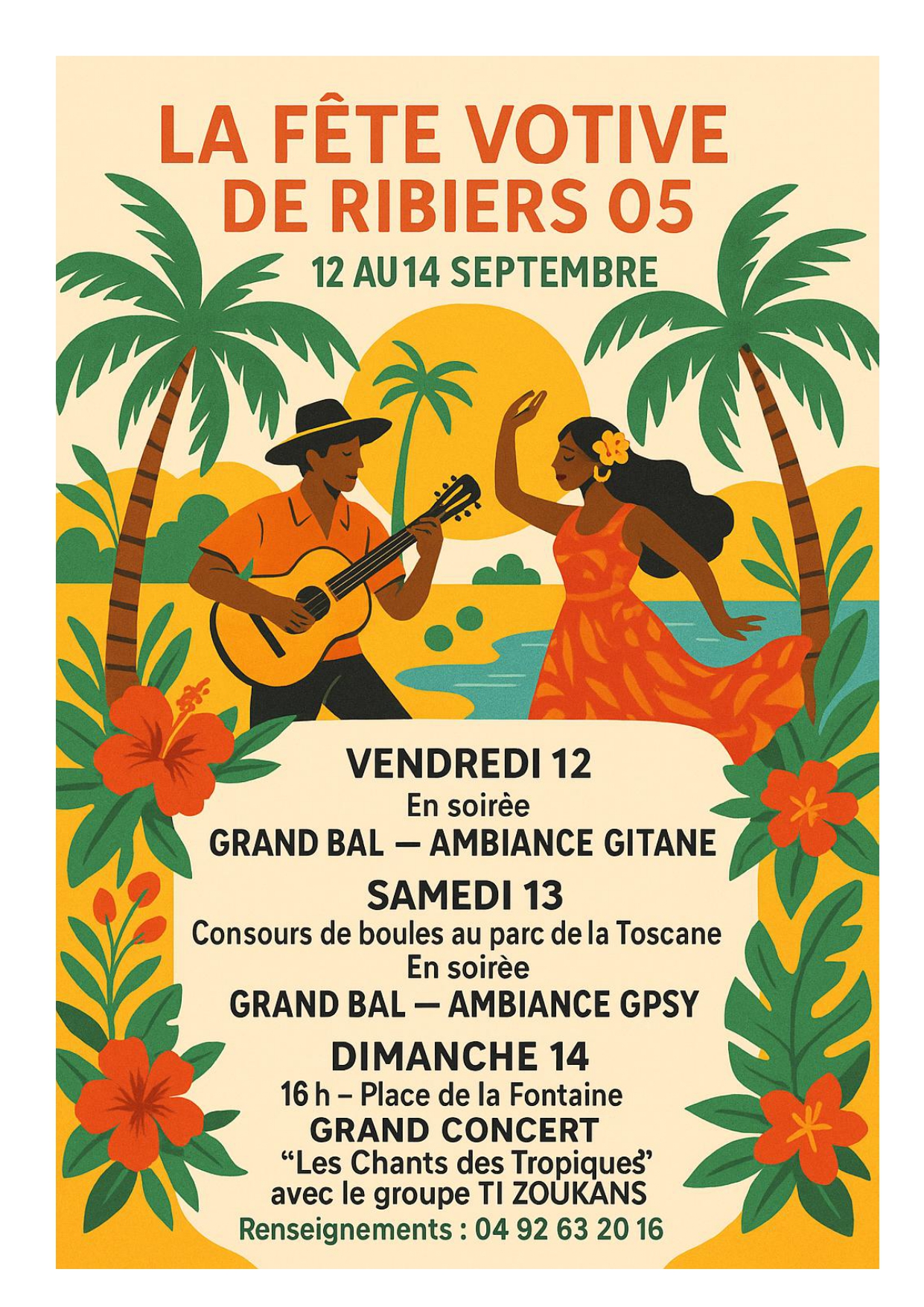 PROGRAMME Vendredi 12 septembre : – en soirée : grand bal – ambiance gitane Samedi 13 septembre : – concours de boules au Parc de la Toscane – en soirée : grand bal – ambiance gipsy Dimanche 14 septembre : – 16h, place de la Fontaine : grand concert gratuit “Les chants des Tropiques” avec le groupe Ti Zoukans – 17h45 : verre de l’amitié Parc de la Toscane
