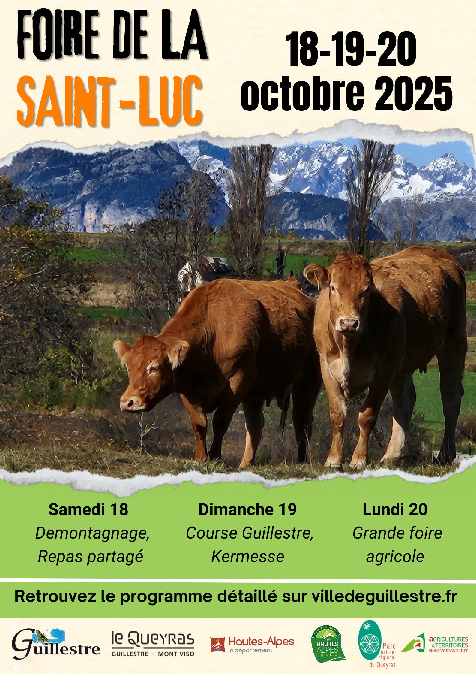 La foire agricole avec les exposants n’a lieu que le lundi, mais tout au long du week-end de nombreuses animations sont proposées, le coeur de Guillestre bat fort au rythme de l’agriculture! Samedi 18 octobre: 11:00: démontagnage dans le centre-ville place Bonnet apéritif offert/ Repas en musique avec Folk You inscriptions obligatoires 13€ à l’Office de Tourisme Spectacle de danses traditionnelles italiennes place Albert Ateliers pour les enfants : promenades en ânes- travail de la laine- stand petits animaux- bulles de savon 20:00: Polenta organisée par l’association des amis de Torre Pellice salle du Queyron (prix à préciser) Dimanche 20 octobre : Course la Guillestroise adultes et enfants le matin. Kermesse des quartiers dans la cour de l’école élémentaire Concert de polyphonies corses à l’église (entrée à 20€) Lundi 21 octobre : Foire agricole de la Saint-Luc Grande foire agricole Concours ovins et bovins Château gonflable place Albert gratuit – jeu du panier garni place Salva 1€ – Grand jeu du Cluedo dans l’enceinte du marché gratuit / Film « Les dernières grandes transhumances » au cinéma 18h (gratuit sur réservation auprès de Cin’valley) puis échange avec l’équipe du film.