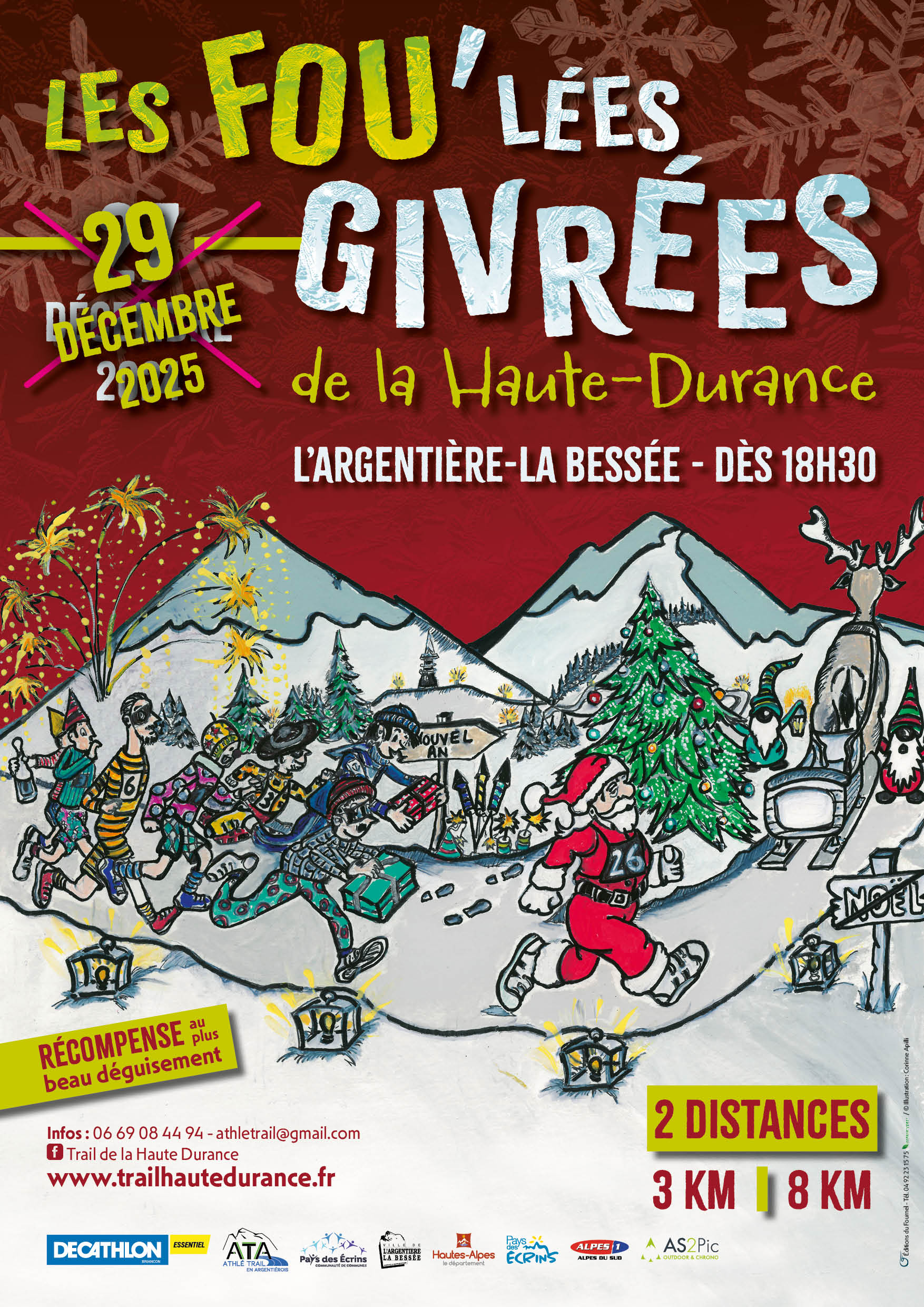à partir de 16h: inscriptions et retrait des dossards au foyer culturel 18h15: course enfants (nés entre 2019 et 2015) départ parvis Mairie 18h35: départ du 3km parvis Mairie 19h15: départ du 8km parvis Mairie autour de 20h15: feu d’artifice à l’arrivée des derniers 20h30: remise des prix dans la foulée Concert de Tortue Jeanine au foyer culturel toute la soirée vin chaud, chocolat chaud, soupe, crêpes, marrons chauds…