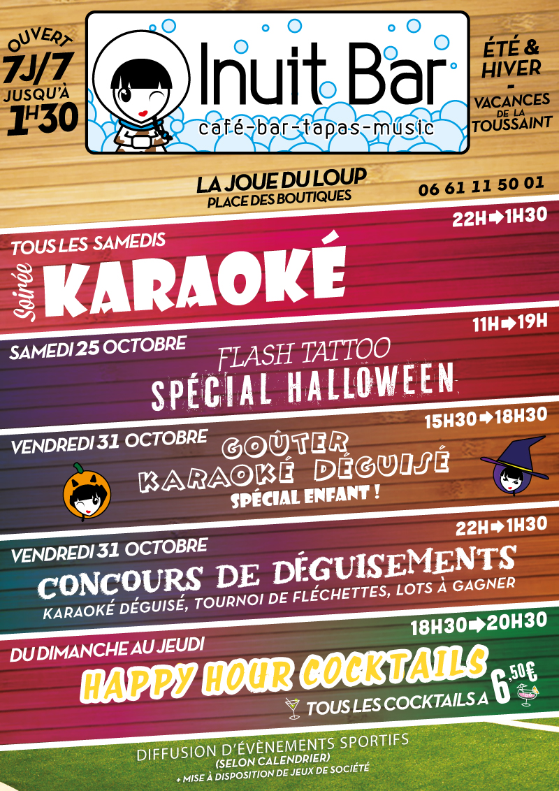 Durant les vacances de la Toussaint, l’Inuit vous invite chaque samedi dès 21h pour une soirée karaoké ! Programme spécial Halloween – 31 octobre : – Goûter karaoké pour enfants – De 15h30 à 18h30 Au menu : un délicieux goûter d’Halloween suivi d’un karaoké spécialement pour les enfants. Sorcières, fantômes et vampires en herbe pourront chanter leurs chansons préférées dans une ambiance ludique et conviviale. Déguisements vivement conseillés ! – Karaoké et tournoi de fléchettes – À partir de 22h Tout le monde pourra interpréter ses hits favoris. De la pop endiablée aux classiques du rock, ambiance festive garantie ! Déguisements obligatoires ! Concours de déguisement Le concours de déguisement viendra couronner le plus effrayant, original ou drôle des costumes ! Que vous soyez un vampire terrifiant, une sorcière ensorcelante ou un monstre hilarant, venez tenter votre chance pour remporter des récompenses surprises. Préparez vos cordes vocales et vos costumes les plus terrifiants pour une journée d’Halloween inoubliable au Inuit Bar !