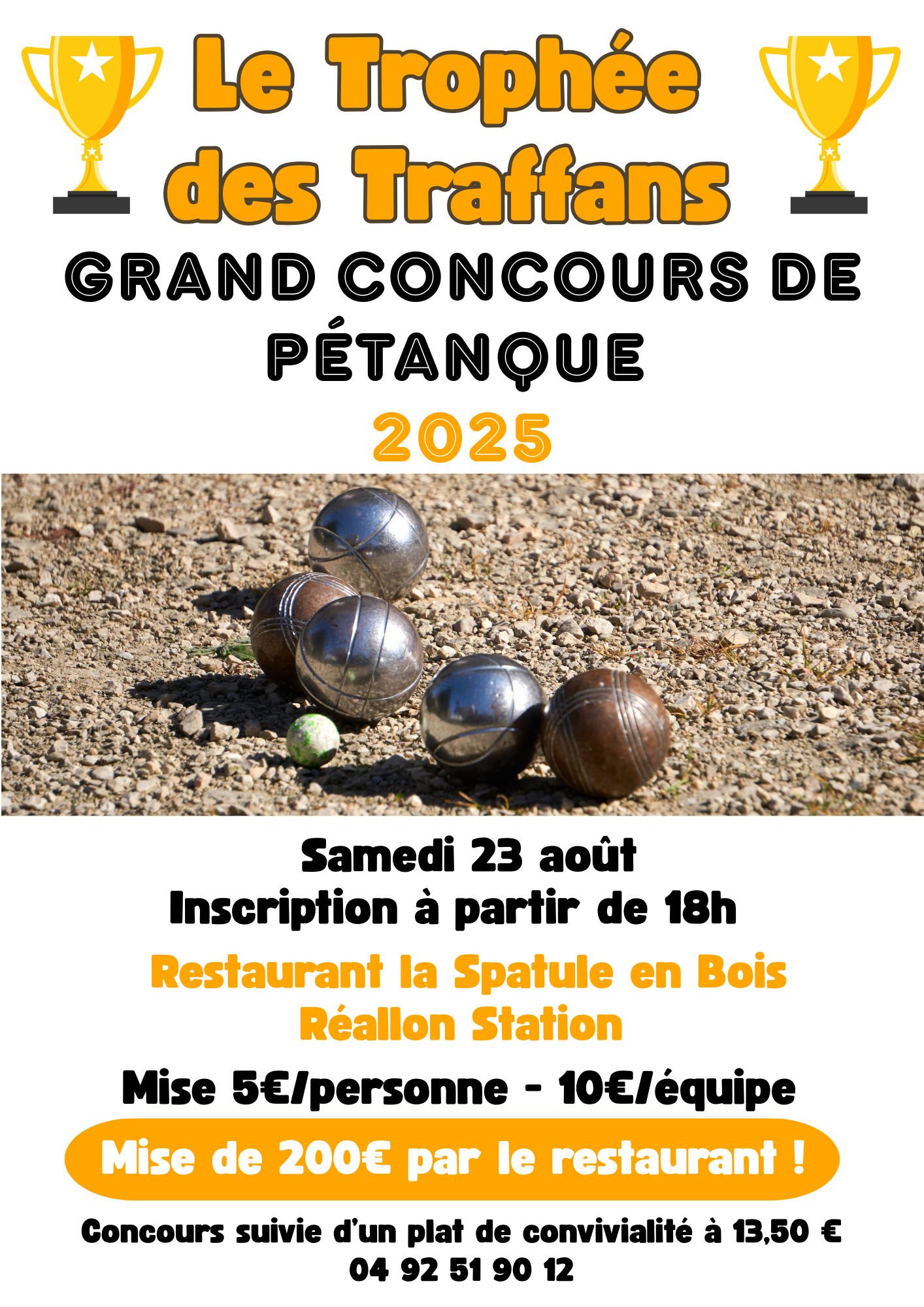Équipe de 2, 10€ par équipe. Les 3 premières équipes se partageront 200€ mis par le restaurant la spatule en bois. Un plat de convivialité se fera à la suite du concours de 13.50€ pour partager et échanger sur ce moment très sympathique.