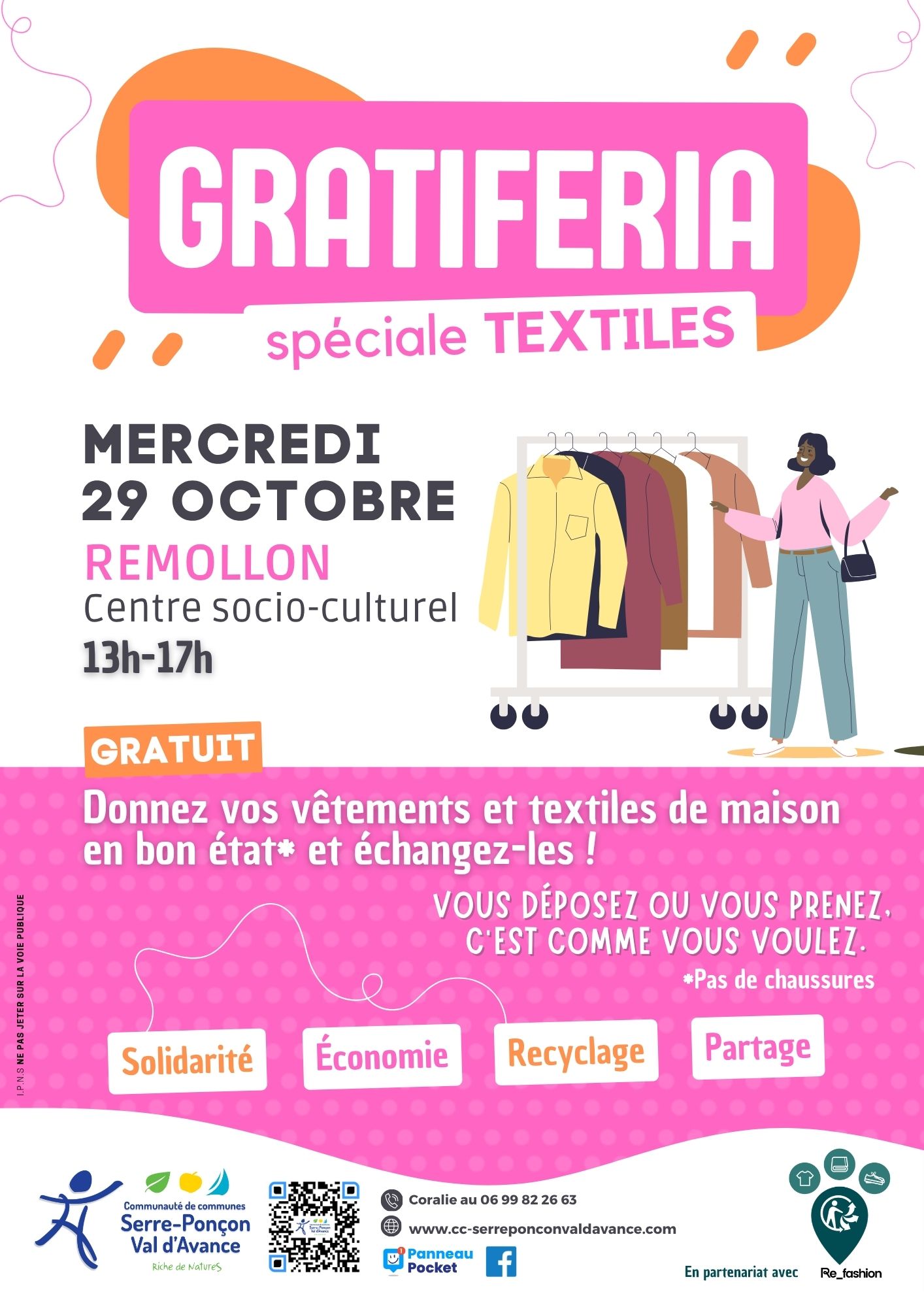 GRATIFERIA TEXTILES au Centre socio-culturel de Remollon, de 13h à 17h mercredi 29 octobre. Apportez vos vêtements* (pas de chaussures) en bon état et textiles de maison, et échangez sur place. 100 % gratuit ! Org. par la Communauté de communes CCSPVA