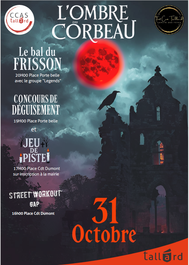 16h démonstration de street workout 17h Jeu de piste place Cdt Dumont (sur inscription à la mairie) 19h Concours de déguisement place Porte Belle 20h Bal du Frisson place Porte Belle avec le groupe “Legends”