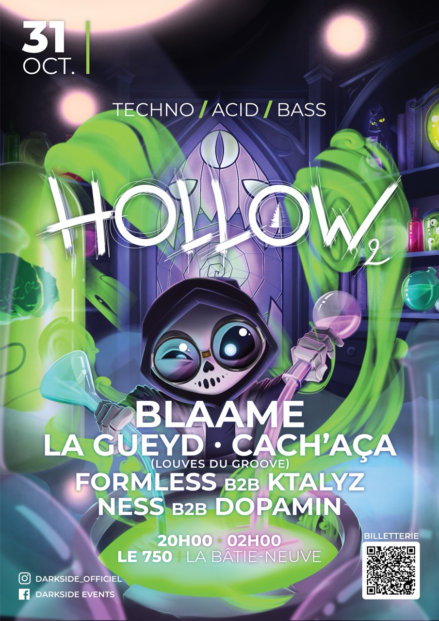 HOLLOW 2 Veille de jour férié Darkside Events revient encore plus fort pour cette deuxième édition spéciale Halloween après un premier round mémorable ! Cette année, on t’invite dans notre laboratoire… Entre expériences secrètes et techniques occultes, nos savants fous du son et des arts numériques vous transportent au cœur de leurs expérimentations Viens célébrer Halloween avec nous le vendredi 31 octobre au 750, salle de concerts à La Bâtie-Neuve ! Ambiance Techno & more… Line Up : BLAAME – Neorave / Hardtechno https://www.instagram.com/blaamemusic/ CACH’AÇA (Louves du Groove) – Bass Music https://www.instagram.com/cach3.1/ https://www.instagram.com/les_louves_du_groove/ LA GUEYD (Louves du Groove) – Acid Techno https://www.instagram.com/les_louves_du_groove/ NESS B2B DOPAMIN (Darkside Crew) – Bouncy / Hardtrance https://www.instagram.com/ness._.music/ KTALYZ B2B FORMLESS (Darkside Crew) – DnB / Speedbass https://www.instagram.com/formlessdj/ Le 750 (750 Av. François Mitterrand, 05230 La Bâtie-Neuve) Navettes depuis Embrun, Chorges et Gap (2€/trajet) Système son powered by Darkside Events Scéno immersive by Darkside Events Mapping Bar Espace extérieur Maquillage ️ Prévention fournie par le CSAPA ️ Dispositif SAM : récupère ton bracelet pour des softs gratuits ! Veille de jour férié ⚠️ Sortie définitive ⚠️ Verre et bouteilles interdits ⚠️ Vente d’alcool interdite aux mineurs ⚠️ Mineurs sous la responsabilité d’un tuteur légal Billetterie en ligne ► Phases & Tarifs : Tarif réduit (offre réservée aux abonnés Shotgun, quantité limitée) : 12,99€ Normal Ticket : 15,99€ Late Ticket : 18,99€ Sur place (sous réserve de places disponibles) : 23€ Billetterie sur Shotgun : https://shotgun.live/fr/events/hollow-2 Fonctionnement des navettes Viens et repars en toute sécurité ! Pas de réservation / Paiement sur place / 2€ par trajet ► Allers : Embrun – Chorges – Le 750 : 19H30 Gap – Le 750 : 20H20 Gap – Le 750 : 21H10 Chorges – Le 750 : 21H30 ► Retours : Le 750 – Gap : 00H40 Le 750 – Chorges : 01H20 Le 750 – Gap : 01H50 Le 750 – Embrun : 02H25 ✨ Pensez à veiller les uns sur les autres, notre équipe (bénévoles, sécurité) sera à votre écoute tout au long de la soirée. N’hésitez pas à les solliciter ! Good vibes & safe place