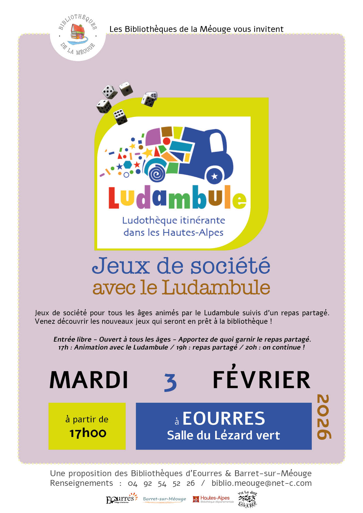 Il y aura des jeux de tous style, pour petits et plus grands (et vice-versa), alors venez les découvrir. Entrée libre – Ouvert à tous les âges – Apportez de quoi garnir le repas partagé. Une proposition des Bibliothèques d’Eourres & Barret-sur-Méouge Renseignements : 04 92 54 52 26 / biblio.meouge@net-c.com