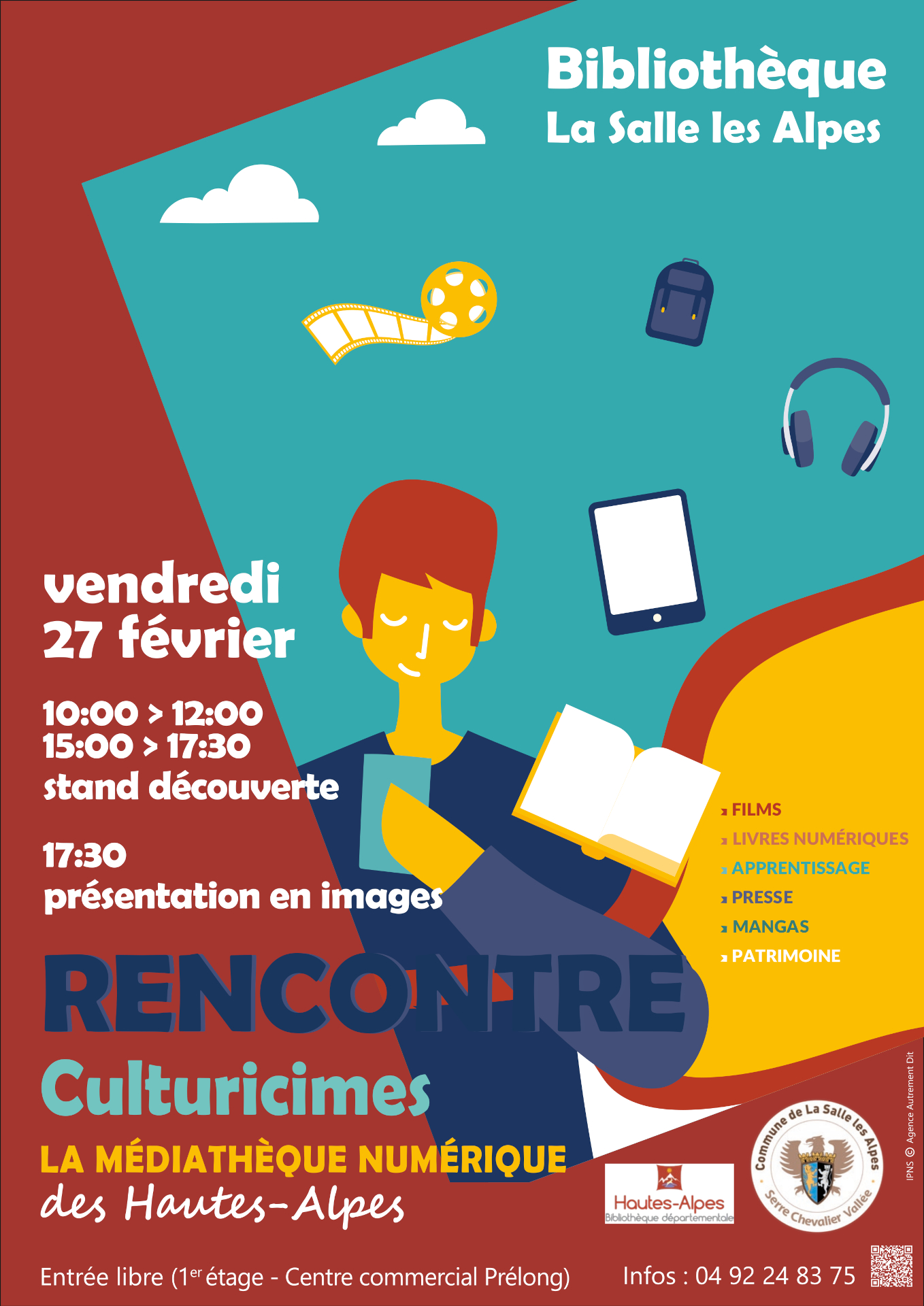 Pour tout savoir sur la médiathèque numérique des bibliothèques haut-alpines La plateforme « Culturicimes » propose une offre culturelle accessible 7/7 et 24/24 avec des films, livres, mangas, presse, jeunesse… Les passionnés d’histoire comme les simples curieux peuvent également explorer librement une rubrique « Patrimoine » puisant dans les documents numérisés par les Archives départementales et la base Gallica de la Bibliothèque nationale de France. L’accès à la plateforme est gratuit pour les abonnés des bibliothèques des Hautes-Alpes. L’équipe de la bibliothèque départementale des Hautes-Alpes sera présente pour présenter ce service offert à tous les abonnés des bibliothèques du réseau départemental. Pour vous initier ou découvrir en détail l’offre culturelle de la médiathèque en ligne, venez échanger avec les bibliothécaires qui répondront à toutes vos questions et vous accompagneront pour vous inscrire sur la plateforme « Culturicimes » et accéder à vos livres, revues et films préférés.