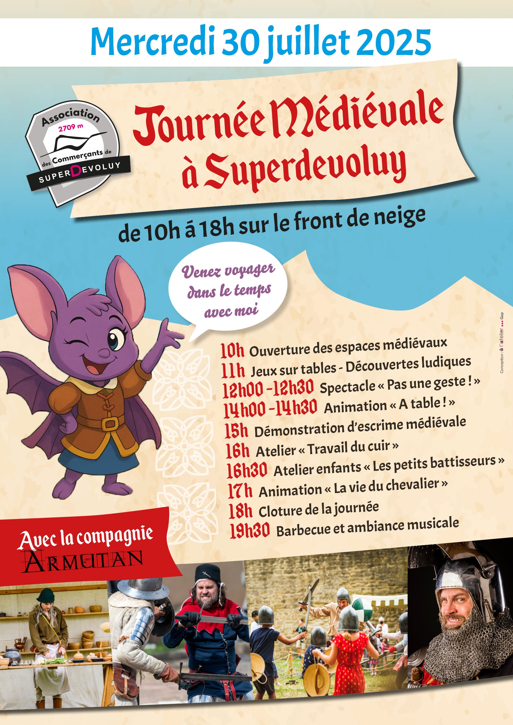 Au programme : – 10h : ouverture des espaces médiévaux ; – 11h : Jeux sur tables, découvertes ludiques ; – 12h à 12h30 : spectacle “Pas un geste !” ; – 14h à 14h30 : animation “À table !” ; – 15h : démonstration d’escrime médiévale ; – 16h : atelier “Travail du cuir” ; – 16h30 : atelier enfants “Les petits bâtisseurs ; – 17h : animation “La vie du chevalier” ; – 18h : clôture de la journée ; – 19h30 : barbecue et ambiance musicale. Organisé par l’Association des Commerçants de Superdévoluy, avec la compagnie Armutan.