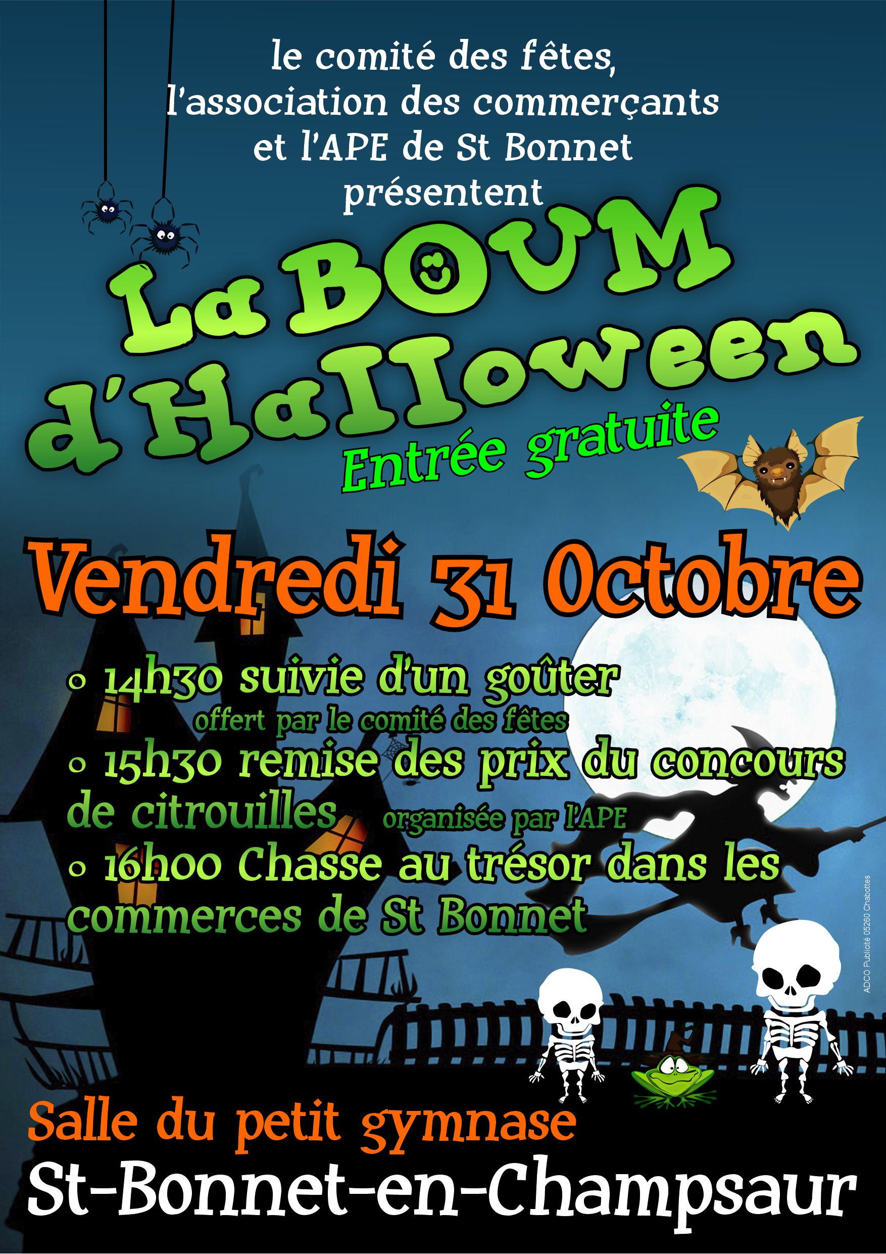 Au programme : – 14h30 La Boum d’Halloween suivi d’un goûter offert par le comité des fêtes – 15h30 Remise des prix du concours de citrouilles organisée par l’APE : concours ouvert aux élèves de l’école : les 3 plus belles mises en scène de chaque catégorie (photos) seront récompensées.. – 16h Chasse au trésor dans les commerces de St Bonnet