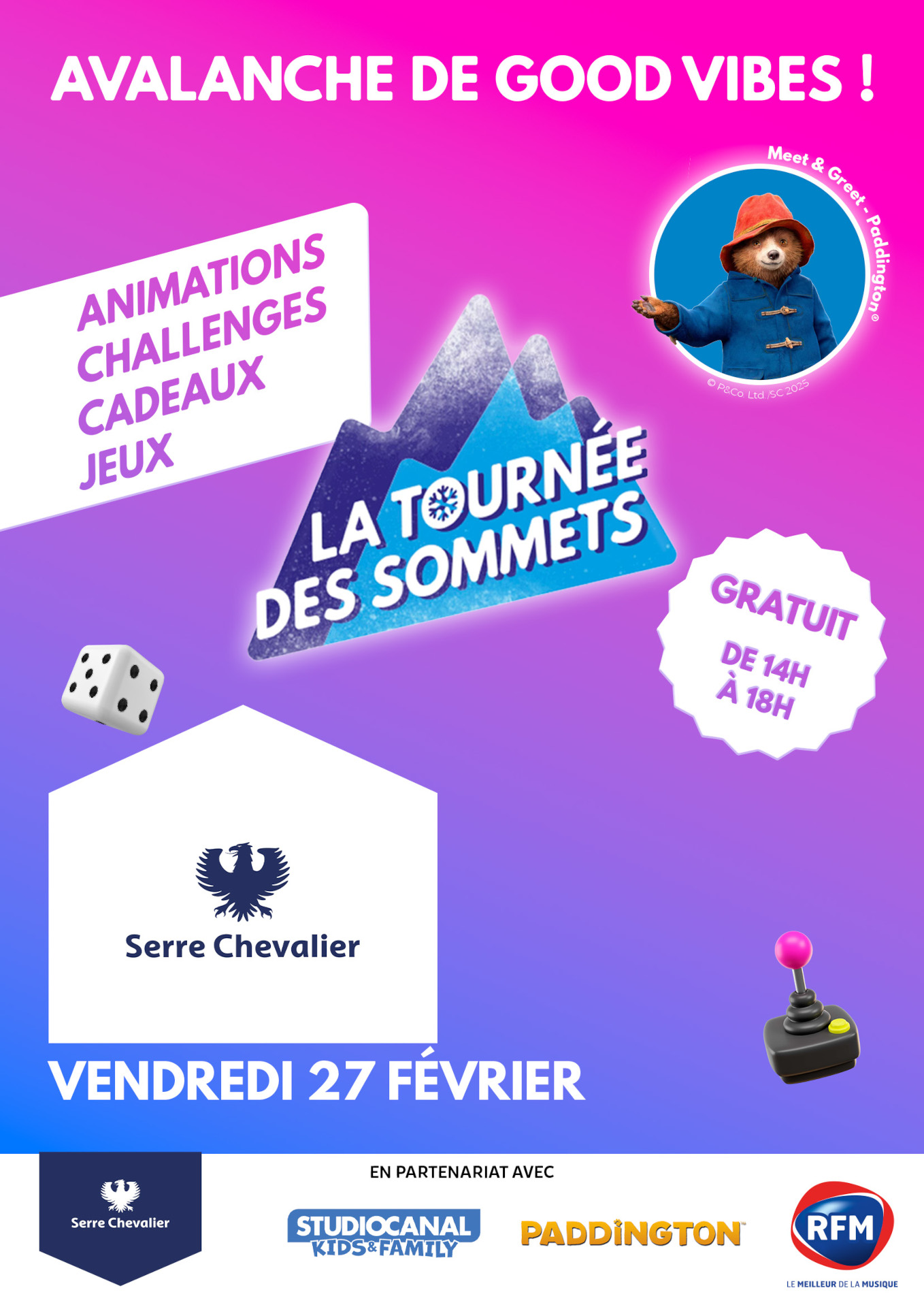 Quand la montagne devient un terrain de jeu géant, la Tournée des Sommets fait vibrer les Alpes. Un événement festif avec musique, jeux, mini-shows et cadeaux à gagner. Au programme, de nombreuses animations avec un festival de surprises dont : – Le Blind Test RFM – Les Mini-shows Petits Filous – Le Toboluge, véritable parcours de luges gonflables – L’initiation à la pétanque sur neige Ainsi que des photos-souvenirs avec l’ours Paddington et des cadeaux à gagner grâce à la borne de jeu interactive avec La Grande Récré et le Futuroscope. Evènement organisé en partenariat avec La Grande Récré, RFM, le Futuroscope, Obut, Petits Filous de Yoplait, Panini, StudioCanal et Paddington.
