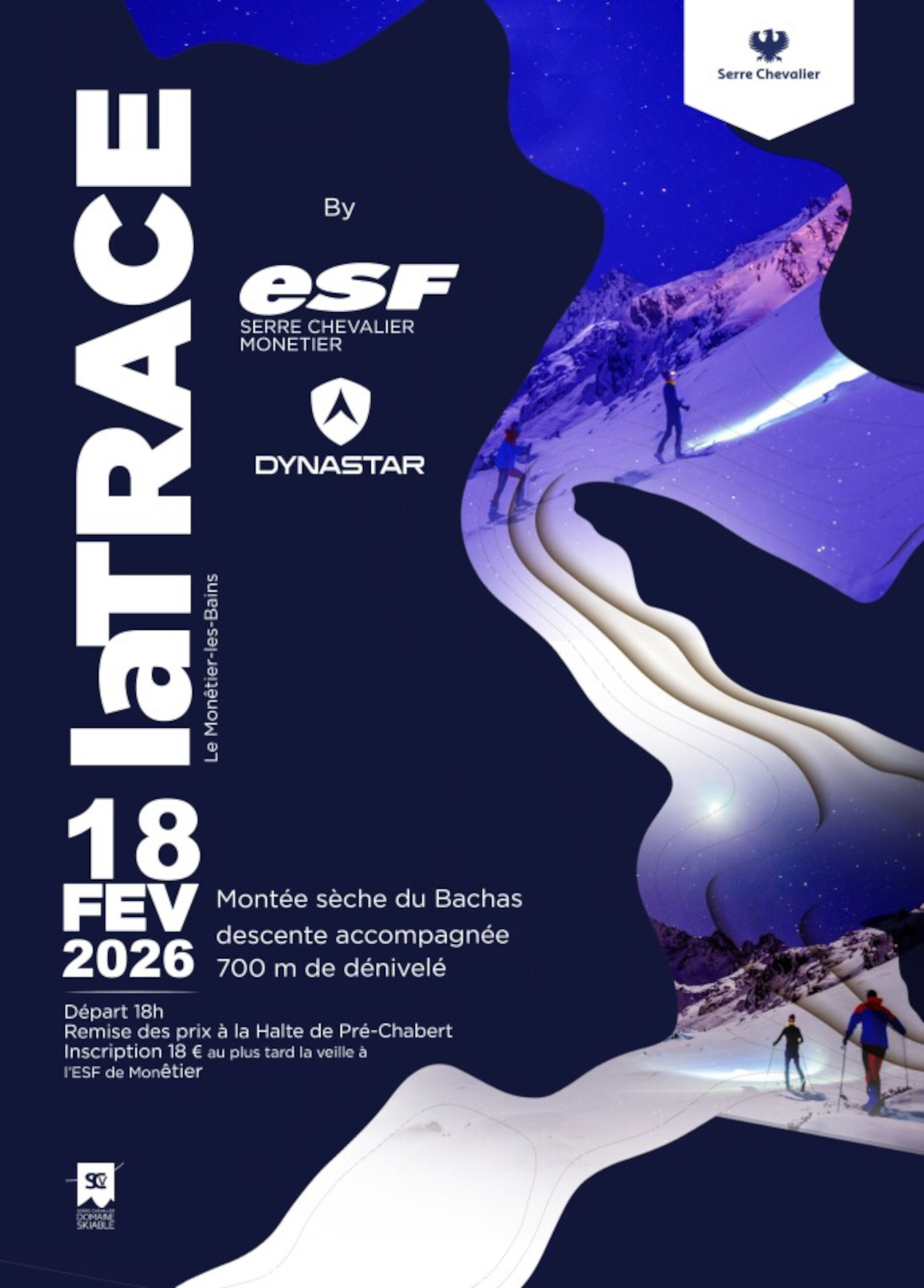 Qu’est-ce que La Trace de Serre Chevalier ? Depuis 2019, l’ESF Serre Chevalier organise chaque année cet événement unique de ski de randonnée. – 19h : Départ en “mass start” de nuit en ski de rando avec une ascension balisée (flambeaux lumineux de direction en place) Montée sèche du Bachas, descente accompagnée, 700 m de dénivelé. Matériel obligatoire : skis de randonnée, peaux de phoque, frontale, et vêtements adaptés à la pratique du ski de rando. Inscription au plus tard la veille au bureau de l’ESF de Monêtier Les Bains.