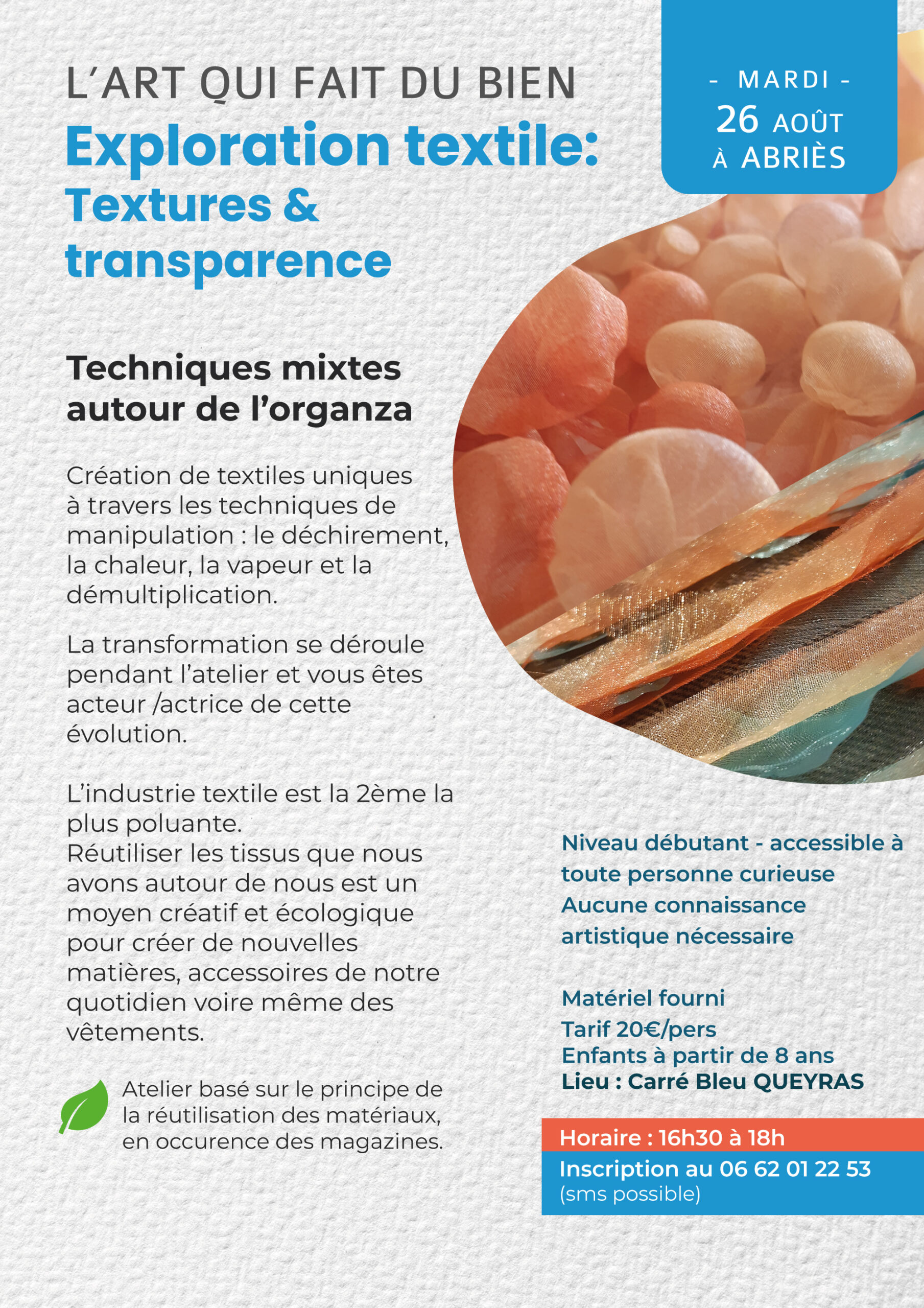 Création de textiles uniques à travers les techniques de manipulation : le déchirement, la chaleur, la vapeur et la démultiplication. La transformation se déroule pendant l’atelier et tu es acteur/actrice de cette évolution. L’industrie textile est la 2ème la plus poluante. Réutiliser les tissus que nous avons autour de nous est un moyen créatif et écologique pour créer de nouvelles matières, accessoires de notre quotidien voire même des vêtements. Niveau débutant – accessible à toute personne curieuse Aucune connaissance artistique nécessaire Matériel fourni Enfants à partir de 8 ans