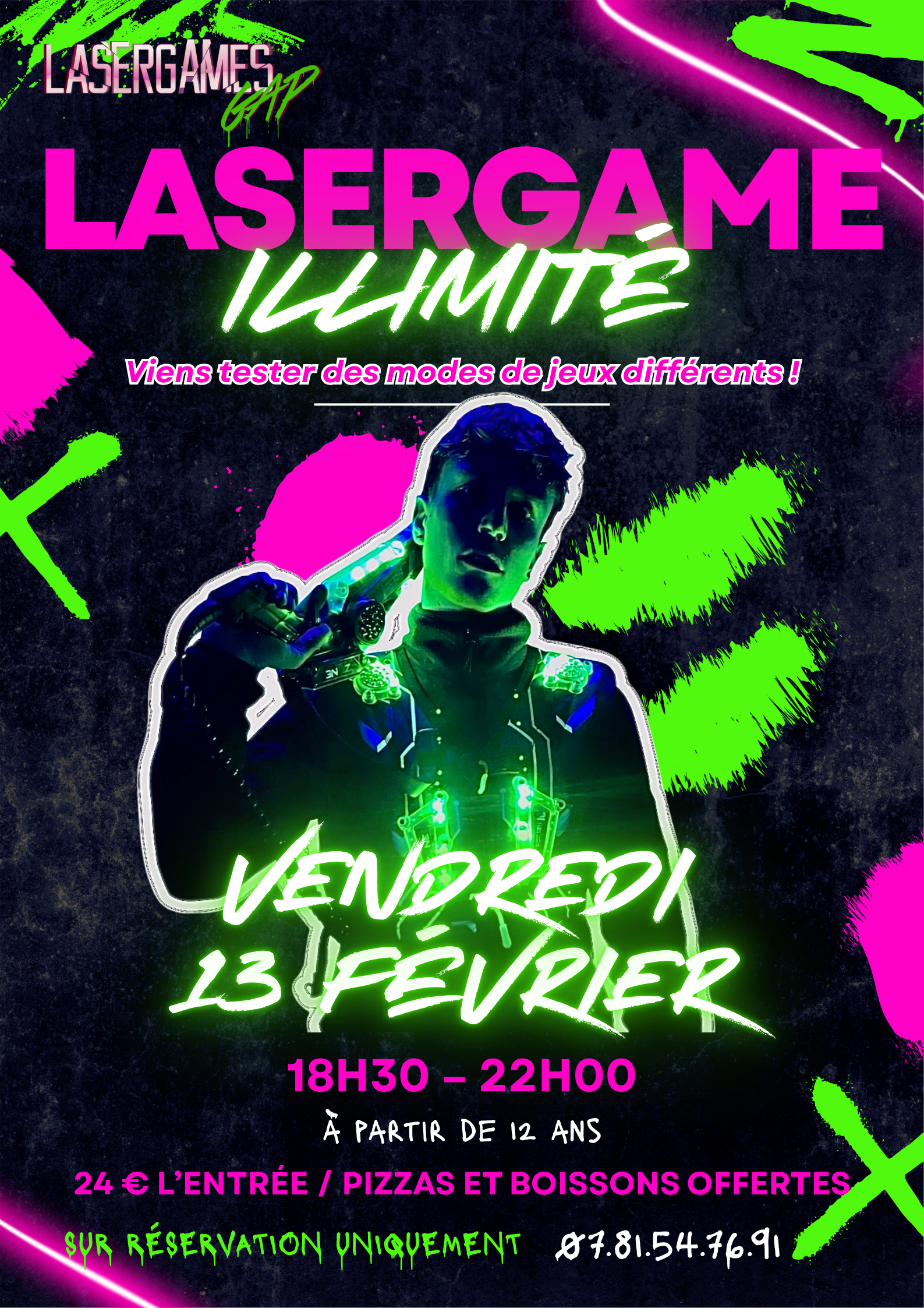 Venez essayer de nouveaux modes de jeux et faire autant de parties que vous le souhaitez. Mélangez vous avec d’autres joueurs (à partir de 12 ans) pour profiter des 500m2 de terrain et gagner la partie ! Pizzas et boissons offertes. Sur réservation uniquement, au 07.81.54.76.91. Venez nombreux !