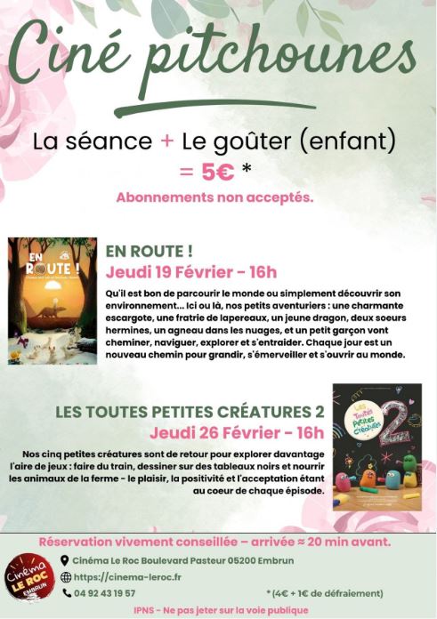 Le cinéma d’Embrun organise deux séances de cinéma les jeudis pendant les vacances : JEUDI 19 FEVRIER – 16H : En Route Qu’il est bon de parcourir le monde ou simplement découvrir son environnement… Ici ou là, nos petits aventuriers : une charmante escargote, une fratrie de lapereaux, un jeune dragon, deux sœurs hermines, un agneau dans les nuages, et un petit garçon vont cheminer, naviguer explorer et s’entraider. JEUDI 26 FEVRIER – 16H : Les Toutes petites créatures 2. Nos cinq petites créatures sont de retour pour explorer davantage l’air de jeux : faire du train, dessiner sur des tableaux noirs et nourrir les animaux de la ferme – le plaisir, la positivité et l’acceptation étant au cœur de chaque épisode. Réservation vivement conseillée au cinéma ou par téléphone : 04 92 43 19 57 Prévoir d’arriver 20 minutes en avance maximum.