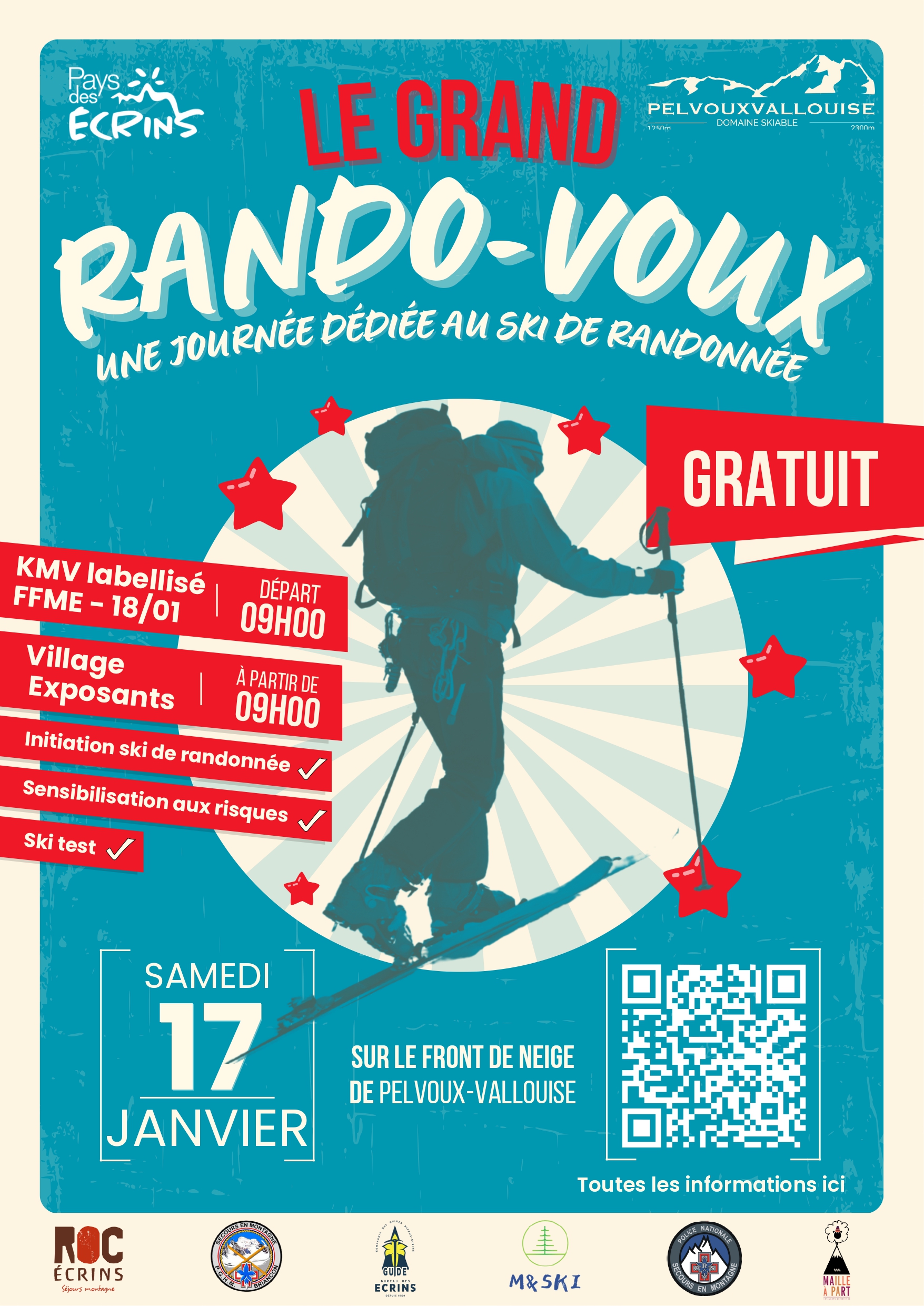 Amateurs de ski de randonnée, préparez vos peaux : le Grand Rando’Voux revient à Pelvoux- Vallouise pour une journée sportive et conviviale, accessible à tous les niveaux. Cet événement incontournable propose un large programme d’animations autour du ski de rando. Au programme : – Village des marques : découverte des nouveautés matériel avec nos partenaires. • Marius SKI : Met à disposition ses créations de ski en bois sur son « stand » en accès gratuit pour les tester • Sorties initiation (300 m D+) encadrées par Roc Écrins – deux créneaux au choix : 9h-12h30 ou 13h-16h30. Inscription payante en amont sur le site ROC ECRINS 70€/pers la demi-journée : Location matériel comprise, kit dva-pelle-sonde, forfait remontées mécaniques, encadrement. Mini 3 pers – maxi 10 pers https://www.roc-ecrins.com/sortie/demi-journee-ski-de-randonnee-grand-rando-voux-17-01-26-sejour-15175.html https://www.roc-ecrins.com/sortie/demi-journee-ski-de-randonnee-grand-rando-voux-17-01-26-sejour-15176.html • Sortie niveau confirmé Objectif Sommet de la Blanche (900 m D+) – 9h-15h/16h. Ces sorties sont proposées à tarif réduit et comprennent l’encadrement, le matériel complet (ski + sécurité) et le forfait. – Ski test : ex : test gratuit du matériel ski en bois (Marius ski) – Ateliers sécurité : apprentissage du maniement DVA, pelle, sonde et bonnes pratiques en montagne. Escape game Avalanche : (Presta du Nordic qui se déroule sur le front de neige) CRS + PGHM : Atelier d’échange et de prévention montagne – gratuit Guide : Présentation de l’activité (ski rando) sortie encadrées sur demande Un événement gratuit (sauf cas Roc écrins), ouvert à tous, pour vivre la passion du ski de randonnée dans un cadre exceptionnel.