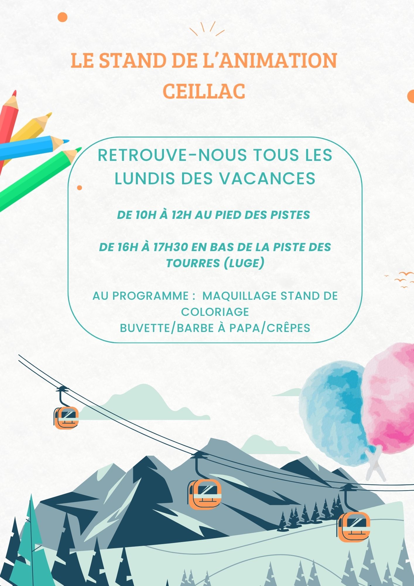 Les lundsi des vacances scolaires, Aude t’accueille de 10h à 12h au pied des pistes de ski alpin et de 16h à 17h30 en bas de la pise de luge des tourres avec maquillage, coloriage, barbe à papa, buvette et crêpes !