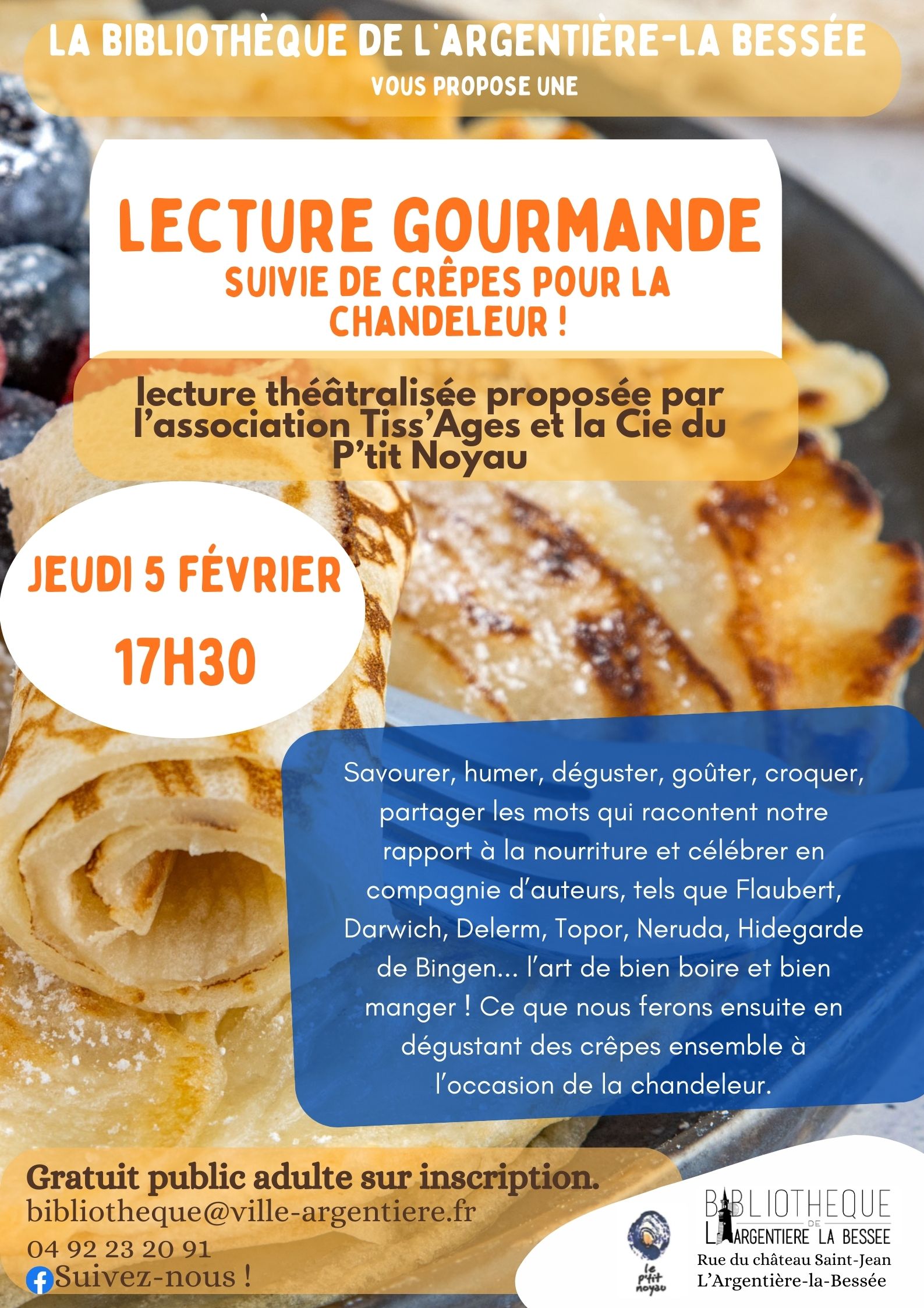 Savourer, humer, déguster, goûter, croquer, partager les mots qui racontent notre rapport à la nourriture et célébrer en compagnie d’auteurs, tels que Flaubert, Darwich, Delerm, Topor, Neruda, Hidegarde de Bingen… l’art de bien boire et bien manger ! Ce que nous ferons ensuite en dégustant la galette des rois ensemble.