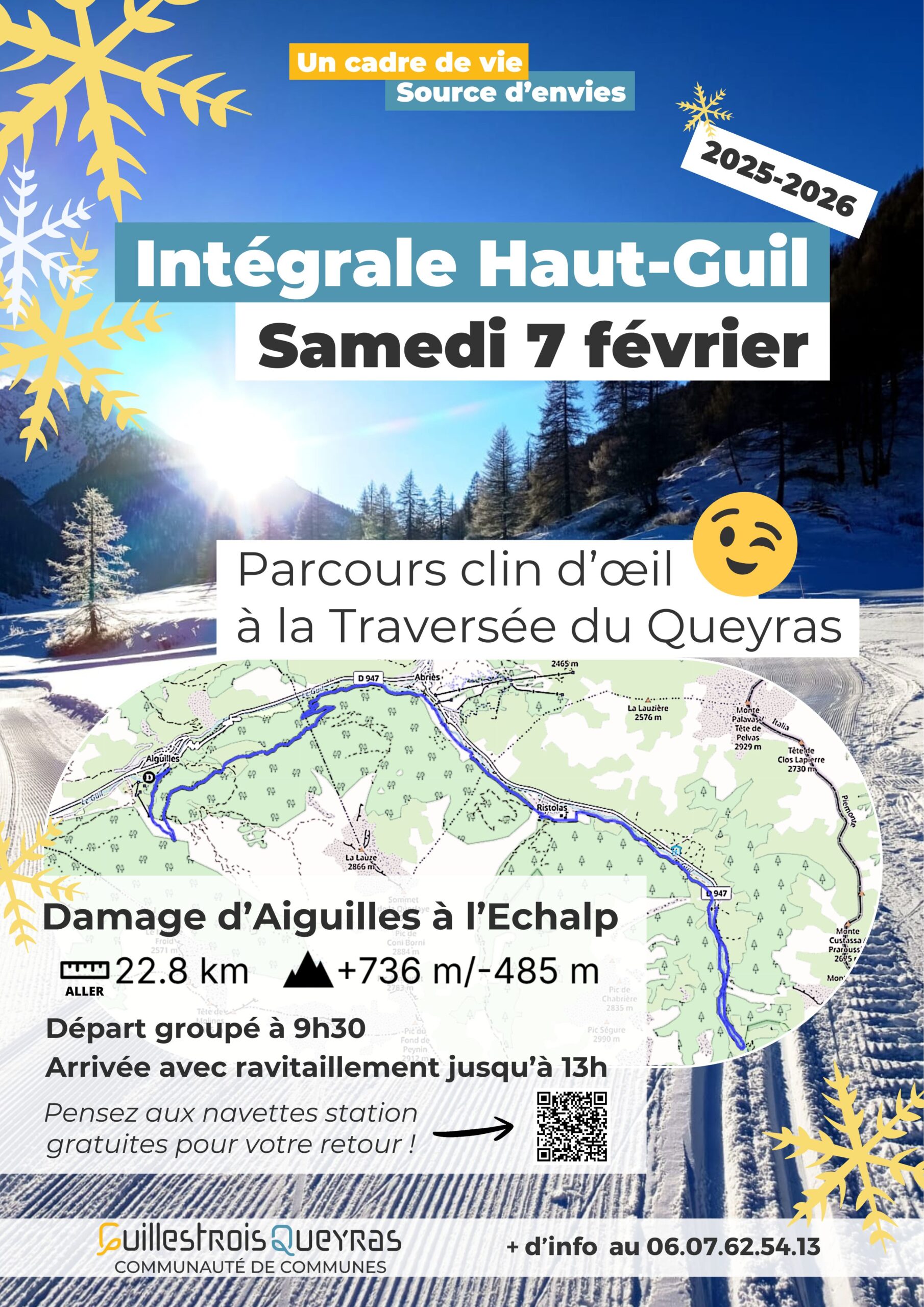Le RDV est à 9H30 sur la plaine des Ribes à Aiguilles. A 13H, un ravito vous sera servi à l’Echalp. 22.8 km, +736m -485m. Pensez aux navettes pour le retour ! La piste est réservée aux fondeurs jusqu’à 13h.