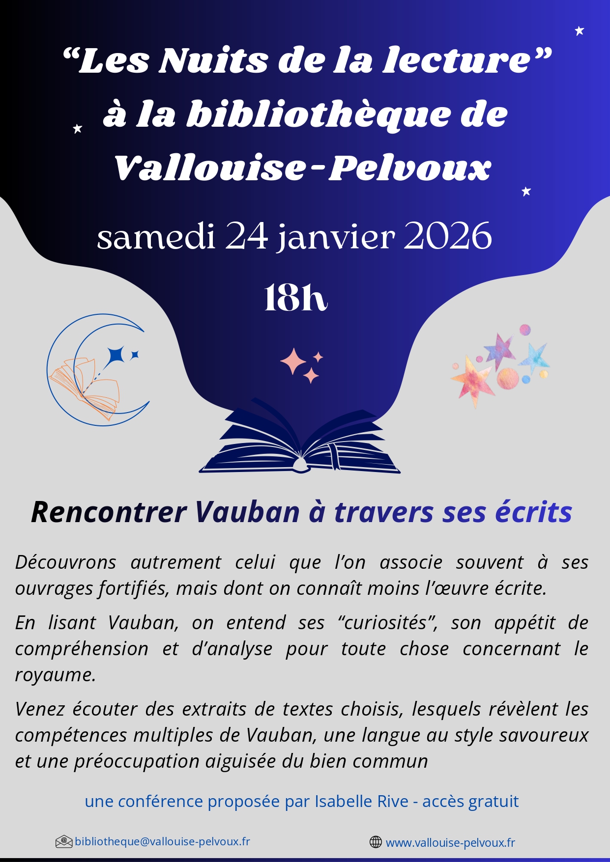 En lisant Vauban, on entend ses “curiosités”, son appétit de compréhension et d’analyse pour toute chose concernant le royaume. Venez écouter des extraits de textes choisis, lesquels révèlent les compétences multiples de Vauban, une langue au style savoureux et une préoccupation aiguisée du bien commun une conférence proposée par Isabelle Rive – accès gratuit mailto:bibliotheque@vallouise-pelvoux.fr www.vallouise-pelvoux.fr