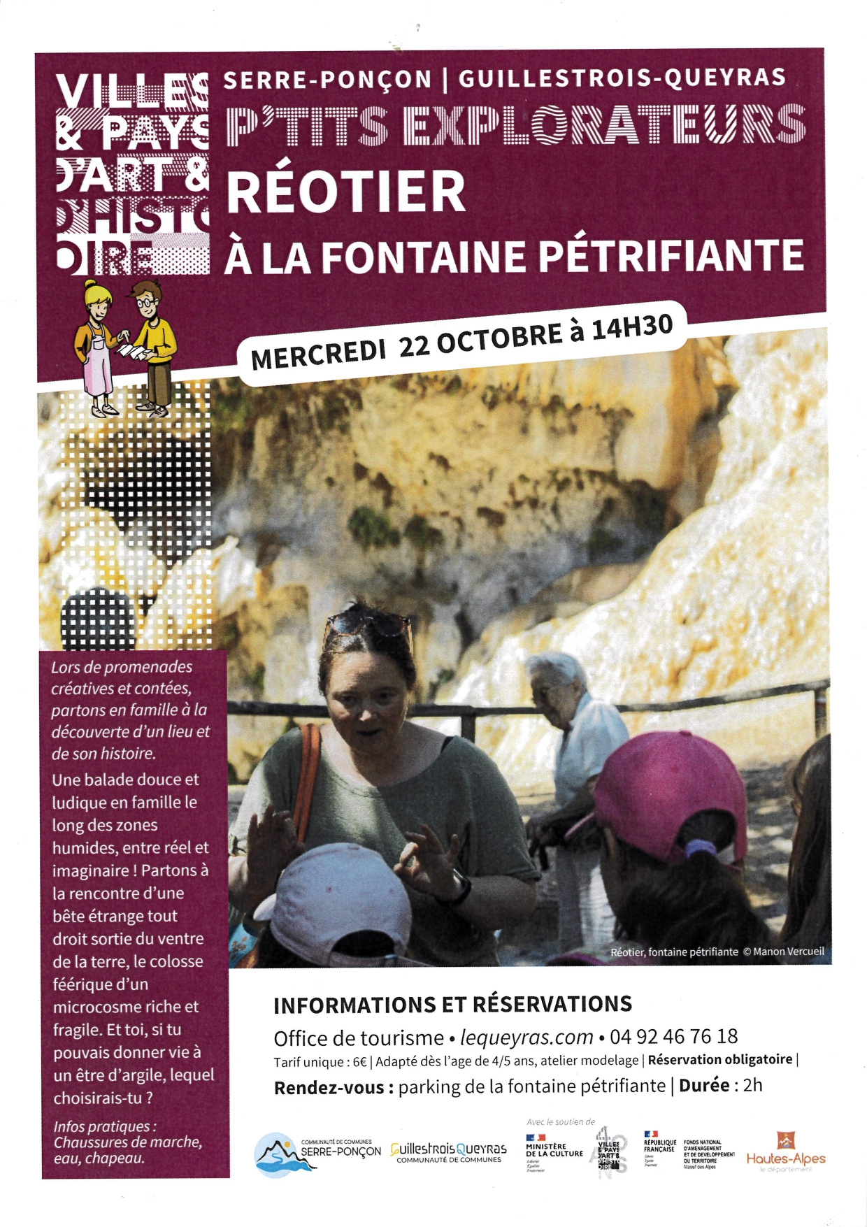 Une balade douce et ludique en famille le long des zones humides, entre réel et imaginaire ! Chaussures de marche, eau, chapeau. Lors de promenades créatives et contées, partons en famille à la découverte d’un lieu et de son histoire avec une médiatrice culturelle du Pays d’art et d’histoire Serre-Ponçon Guillestrois-Queyras. Inscription obligatoire dans les offices de tourisme de Serre-Ponçon et du Guillestrois-Queyras.