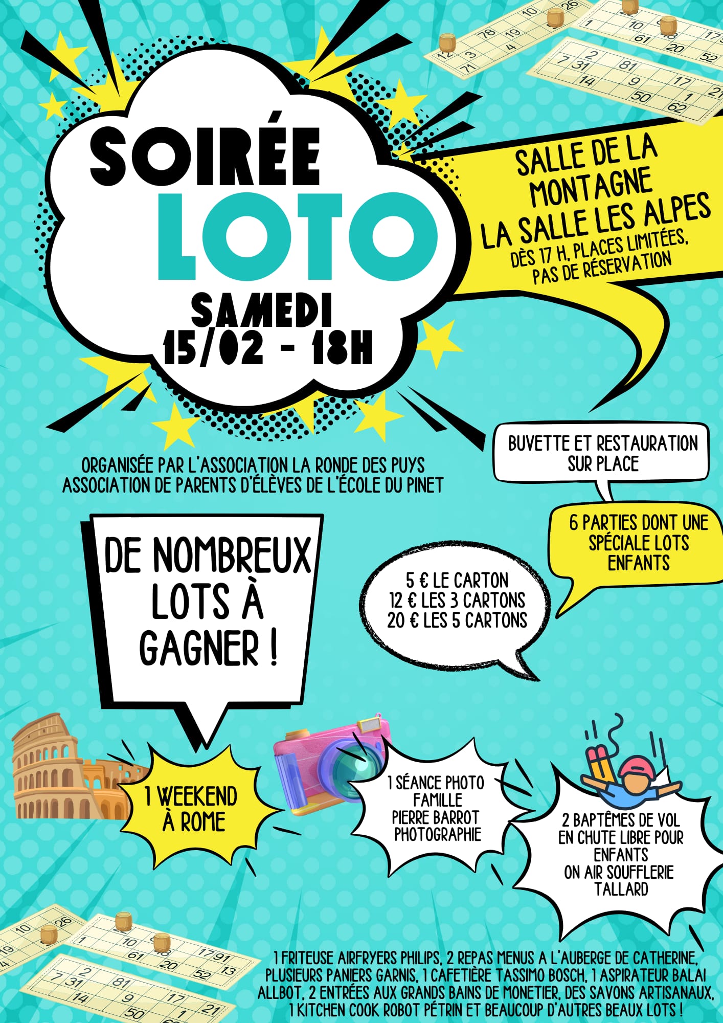 Grand loto pour aider à financer un voyage scolaire. Buvette et petite restauration sur place. A gagner : séjour à Rome pour les adultes, baptême de vol en chute libre pour les enfants, machine à café, robot pâtissier, entrées aux Grands Bains, tyrolienne de Serre Chevalier, séance photo en famille… et pleins d’autres lots. Tombola : un aspirateur balai sans fil à gagner.