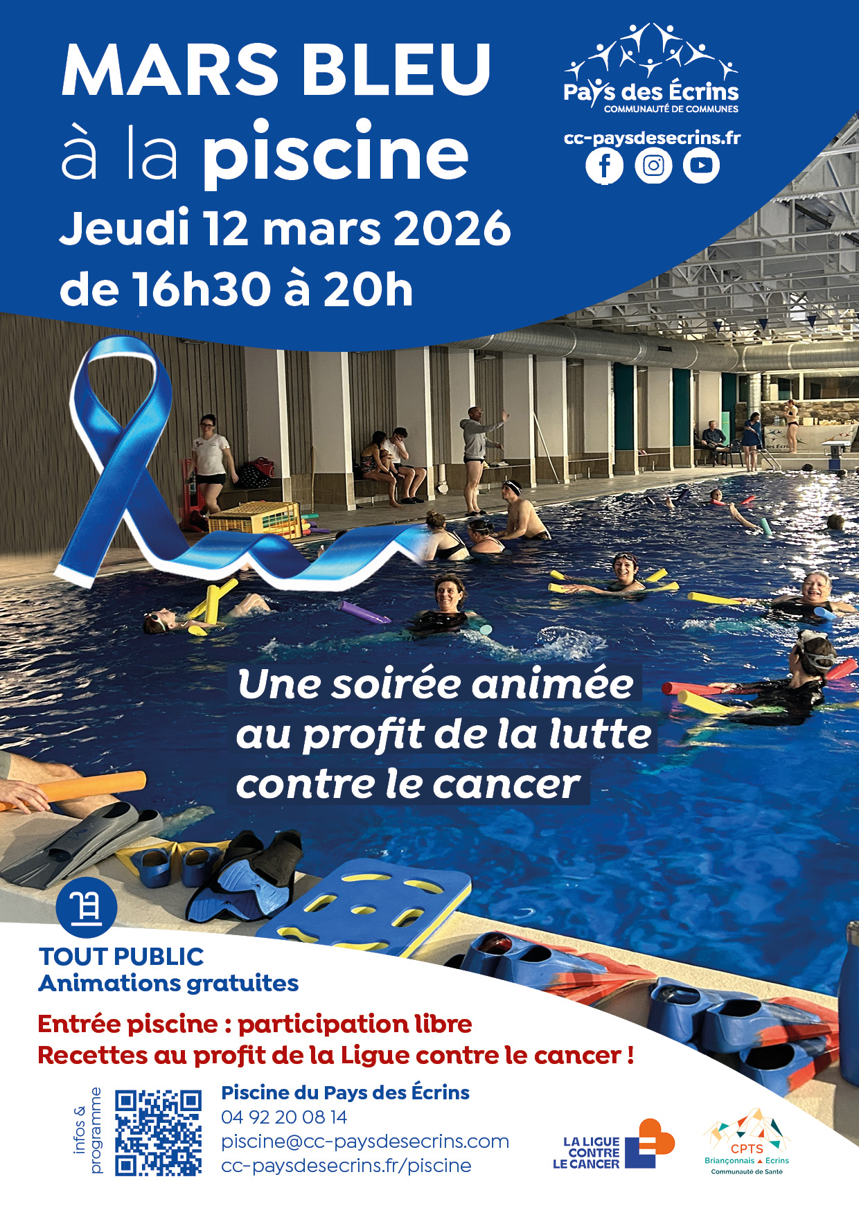 Mars Bleu est le mois de la mobilisation contre le cancer colorectal (2ème cancer le plus meurtrier de France). Cette campagne, pilotée par le Ministère de la Santé et l’Institut nationale du cancer (Inca), vise à sensibiliser la population et les professionnels de santé à l’importance du dépistage. Nouvelle édition d’une soirée animée à la piscine du Pays des Écrins Afin de soutenir MARS BLEU de façon originale, la Communauté de Communes du Pays des Écrins et l’équipe de la piscine se mobilisent pour proposer des animations tout en alliant de la prévention grâce au partenariat avec la Ligue Contre le Cancer.. L’entrée de la piscine se fera sous forme de dons au bénéfice de la Ligue contre le Cancer. > Le bassin sera dédié aux animations encadrées par les professionnelles, aquagym, aquarunning, aqua-palmes et tuba toutes les 15 minutes. Du matériel restera également à disposition du public pour une utilisation libre. > Et pour clôturer la soirée, un blind-test sera proposé vers 19h15 ainsi qu’un défi subaquatique. La Ligue contre le Cancer sera présente avec un stand pour sensibiliser le public et échanger. Venez nombreux !