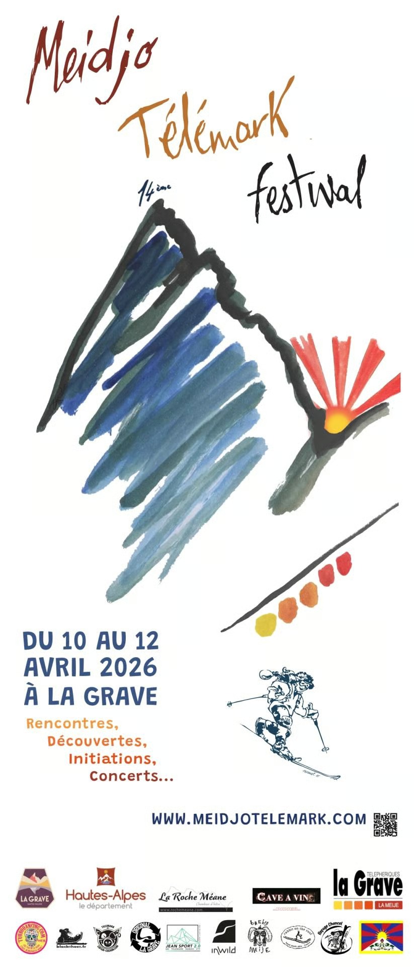 14° Meidjo télémark : Le but du rassemblement Meidjo Télémark Festival est de vous permettre de découvrir le domaine de La Grave ainsi que la pratique du ski télémark. C’est l’occasion rêvée de venir partager cette passion de la génuflexion dont les mots d’ordre sont convivialité, échange, découverte, respect et bonne humeur ! Plus d’informations et programme des journées : Vendredi 10 avril Retrouvailles : Si vous souhaitez glisser sur le Domaine de La Grave dès vendredi, sur présentation de son inscription Meidjo aux caisses du téléphérique, le forfait est à 39 € 16h00 Début des retrouvailles / Inscriptions. Rendez vous à la Salle des Fêtes de la Grave 18h00 Apéro offert par la Cave Didier, grignotage partagé : chacun apporte à boire et à manger 21h00 On vous donne bientôt l’info Samedi 11 avril: Bienvenue les z’amis 8h30 Petit déjeuner tartines / Inscriptions / Prêt de matériel de Télémark* jusqu’à 11H00 (Salle des Fêtes de La Grave) (PENSEZ A PRENDRE VOS BÂTONS) 9h00 Glisse sur le domaine des téléphériques de la Grave 10h00 Initiation Télémark sur la piste du Glacier de la Girose avec un moniteur (durée env 2h00) 14h30 La dernière tous ensemble dans les Vallons de la Meije jusqu’en bas à la Grave. Si si, on peut le faire 16h00 A 2400m : on fait une pose pour un Vin chaud 18h00 On se retrouve à la Salle des Fêtes de La Grave en musique 19h30 Dîner préparé par les restaurateurs locaux 21h00 Concert 23h00 Au dodo demain on se lève tôt Dimanche 12 Avril : « On glisse ensemble » 8h30 Petit déjeuner tartines / Inscriptions / Prêt de matériel de Télémark* (Salle des Fêtes de La Grave) (PENSEZ A PRENDRE VOS BÂTONS) 9h00 Encadrement Guide de Haute Montagne (sur inscription) (initiation rando glacière, … en fonction des conditions du moment) 10h00 Initiation Télémark sur la piste du Glacier de la Girose avec un moniteur (durée env. 2h00) 12h30 On part tous ensemble de 3200 pour descendre dans les Vallons de Chancel 13h30 Déjeuner au refuge Chancel La journée n’est pas terminée, on a encore le temps de s’amuser et génuflexer sur le domaine de la Grave NB : L’organisateur se réserve le droit de faire évoluer le programme en fonction notamment des conditions météo du jour * Sous réserve de disponibilité
