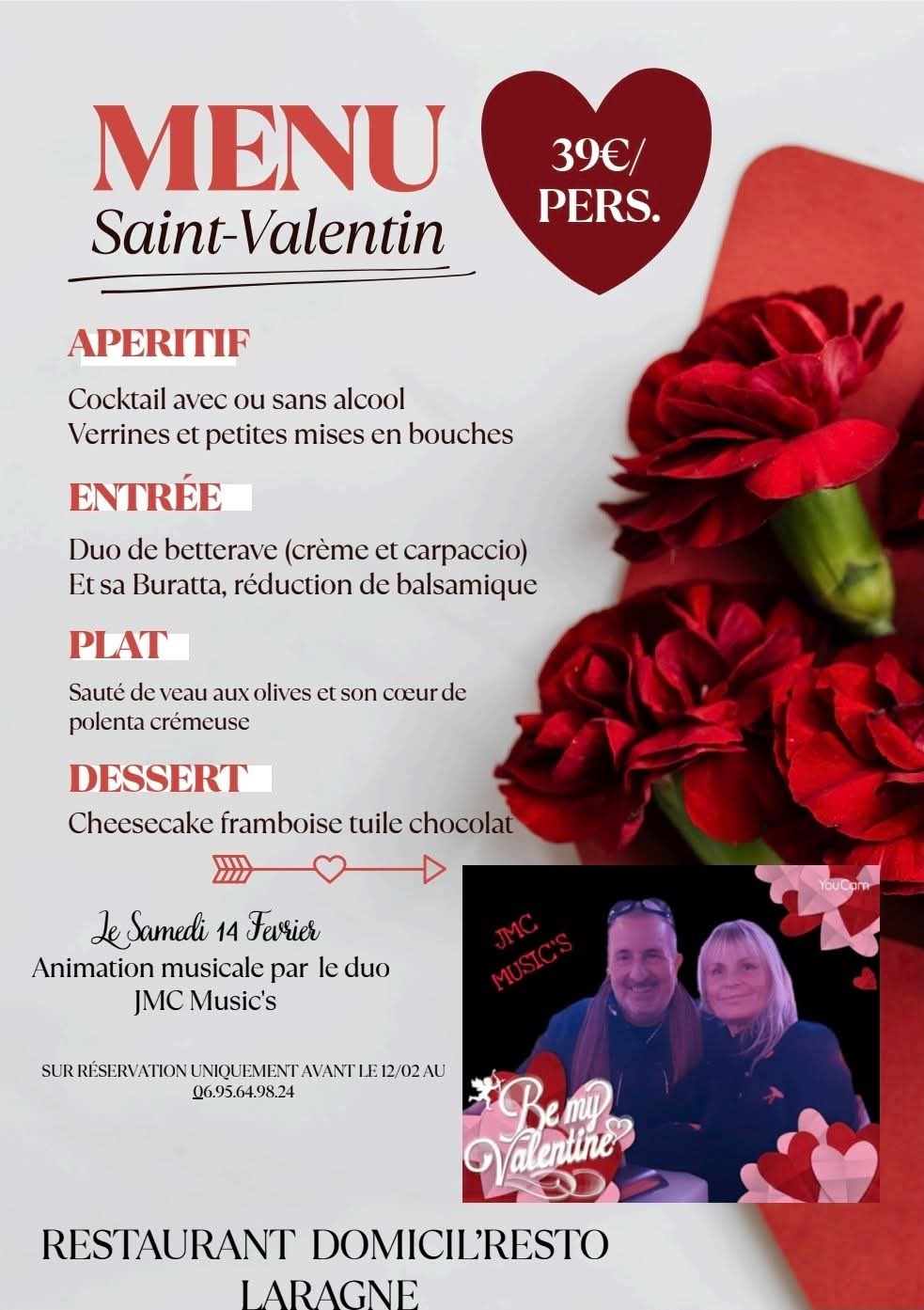 Apéritif : Cocktail avec ou sans alcool Verrines et petites mises en bouche Entrée : Duo de betteraves (crème et carpaccio) et sa burrata, réduction de balsamique Plat : Sauté de veau aux olives et son cœur de polenta crémeuse Dessert : Cheesecake framboise tuile chocolat
