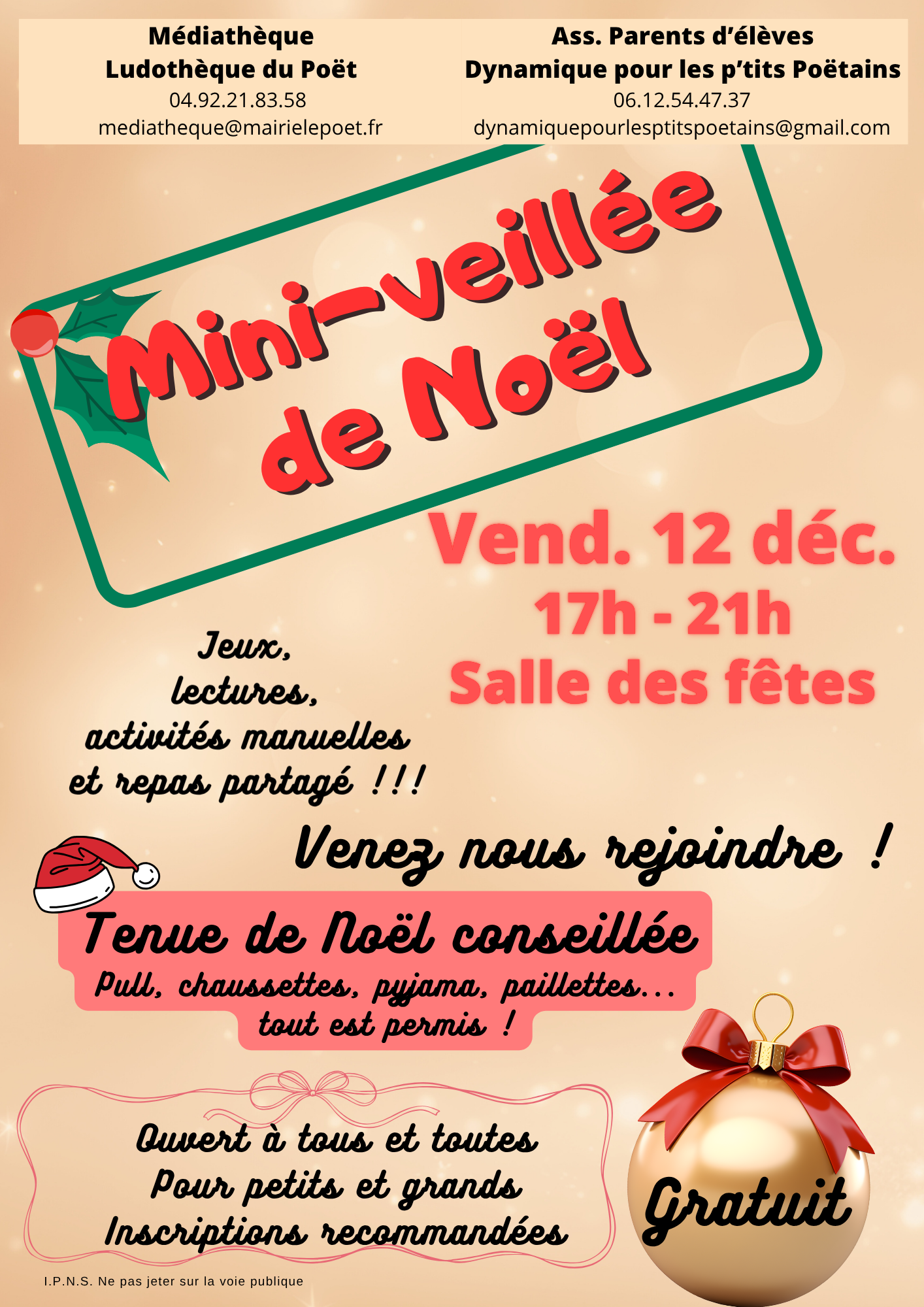 Tenue de Noël conseillée : pull, chaussettes, pyjamas, paillettes… tout est permis ! Animation en partenariat avec l’Association des Parents d’ Élèves Dynamique pour les p’tits Poëtains.