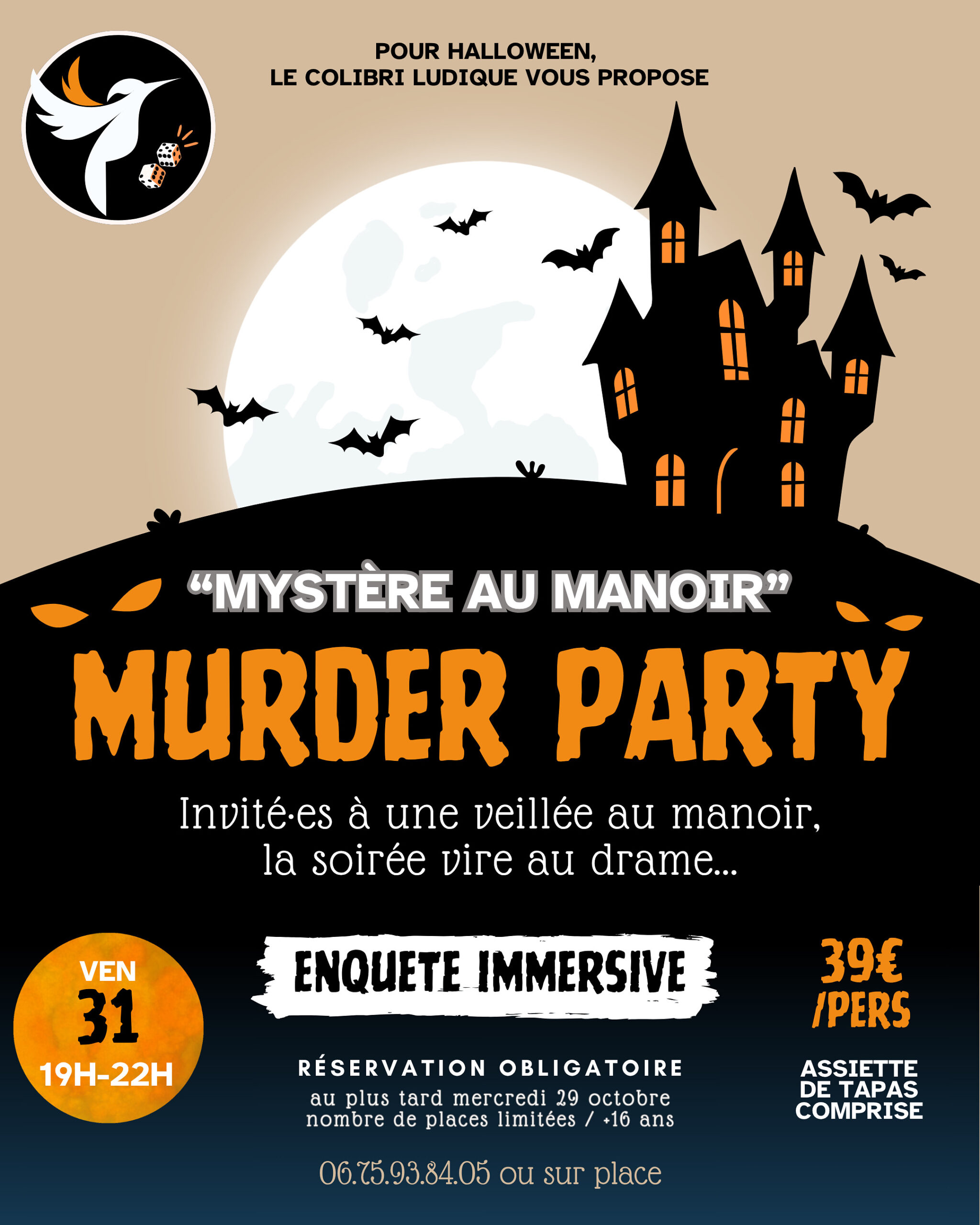 MURDER PARTY : « MYSTÈRES AU MANOIR » Une veillée qui tourne au drame, venez vivre une enquête immersive en incarnant l’un des personnages invités au Manoir ! Nombre de places limitées, +16 ans. Réservation obligatoire (par SMS ou sur place)