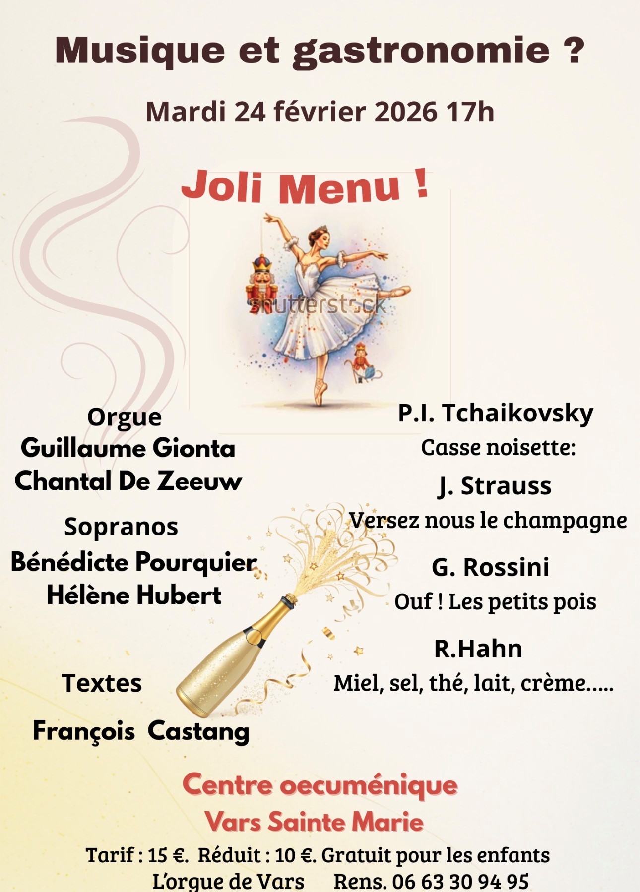 Musique et Gastronomie … Les rapports entre l’art culinaire et l’art des sons sont nombreux, anciens et remarquables ! Quelques exemples dans ce concert, avec des extraits d’oeuvres choisies de compositeurs connus qui seront ponctués et complétés avec des textes dits par François Castang, récitant. Ces musiques seront interprétées par G. Gionta et C.De Zeeuw, souvent à quatre mains, sur l’orgue de Vars. Deux sopranos, Bénédicte Pourquier et Hélène Hubert ajouteront une touche d’humour avec des extraits d’opérettes de R. Hahn, J. Strauss et J. Offenbach.