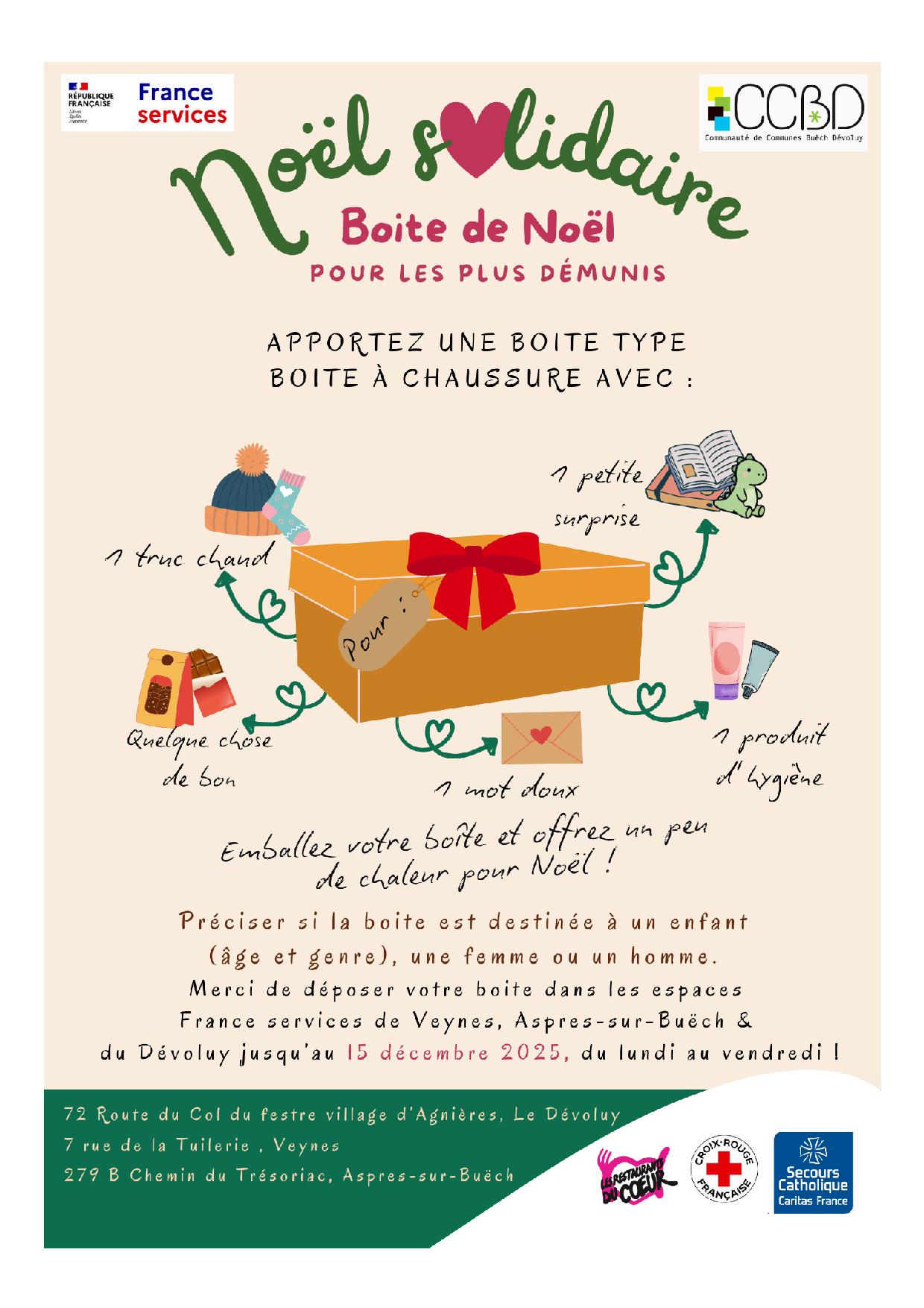 Apportez une boîte de type “boîte à chaussure” en la garnissant : – d’un truc chaud (gants, bonnet…) – quelque chose de bon (chocolats, bonbons…) – une petite surprise (livre, jouet …) – un produit d’hygiène (parfum, savon…) et sans oublier un petit un mot doux ! Emballez votre boîte et offrez un peu de chaleur pour Noël ! Précisez si la boite est destinée à un enfant (âge et genre), une femme ou un homme. Merci de dépose votre boîte dans les espaces France services de Veynes, Aspres sur Buëch et du Dévoluy jusqu’au 15 décembre du lundi au vendredi.