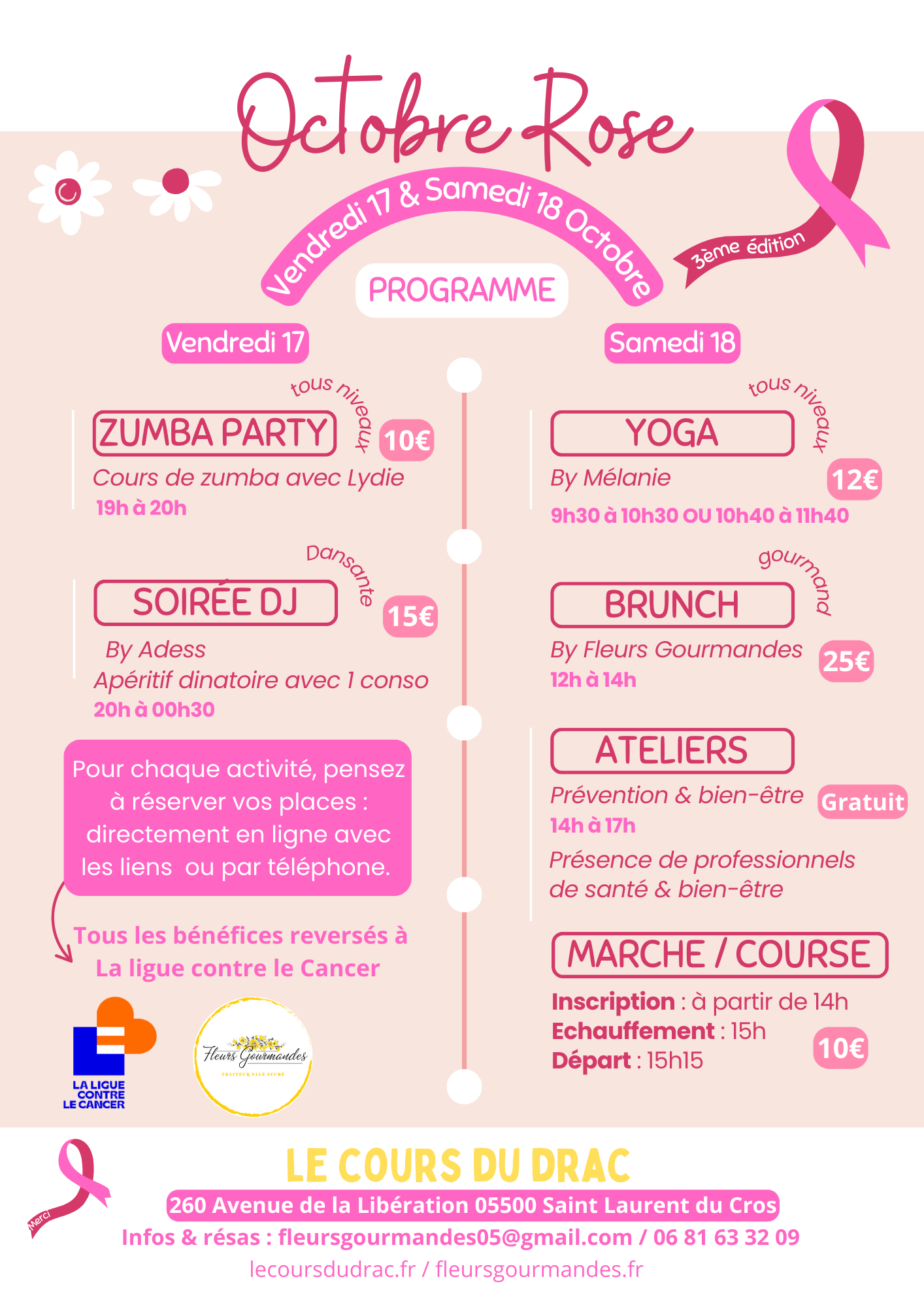 Vendredi 17: 19h à 20h Zumba party tous niveaux avec Lydie 10€ suivi d’une soirée DJ by Adess, apéritif dinatoire avec 1 conso 15€. Samedi 18: 9h30 ou 10h40 : Yoga tous niveaux by Mélanie 12€ puis de 12h à 14h : Brunch gourmand 25€ ; 15h15 Marche/course 10€ (Inscription à partir de 14h et échauffement à 15h). De 14h à 17h ateliers prévention & bien être.