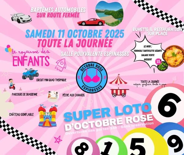 OCTOBRE ROSE revient à ESPINASSES pour l’édition 2025 ! Samedi 11 Octobre 2025 une journée pas comme les autres vous attend : Baptêmes autos | Animations enfants | Tartiflette géante à 12h | Super loto à 14h. Venez nombreux soutenir Octobre Rose !