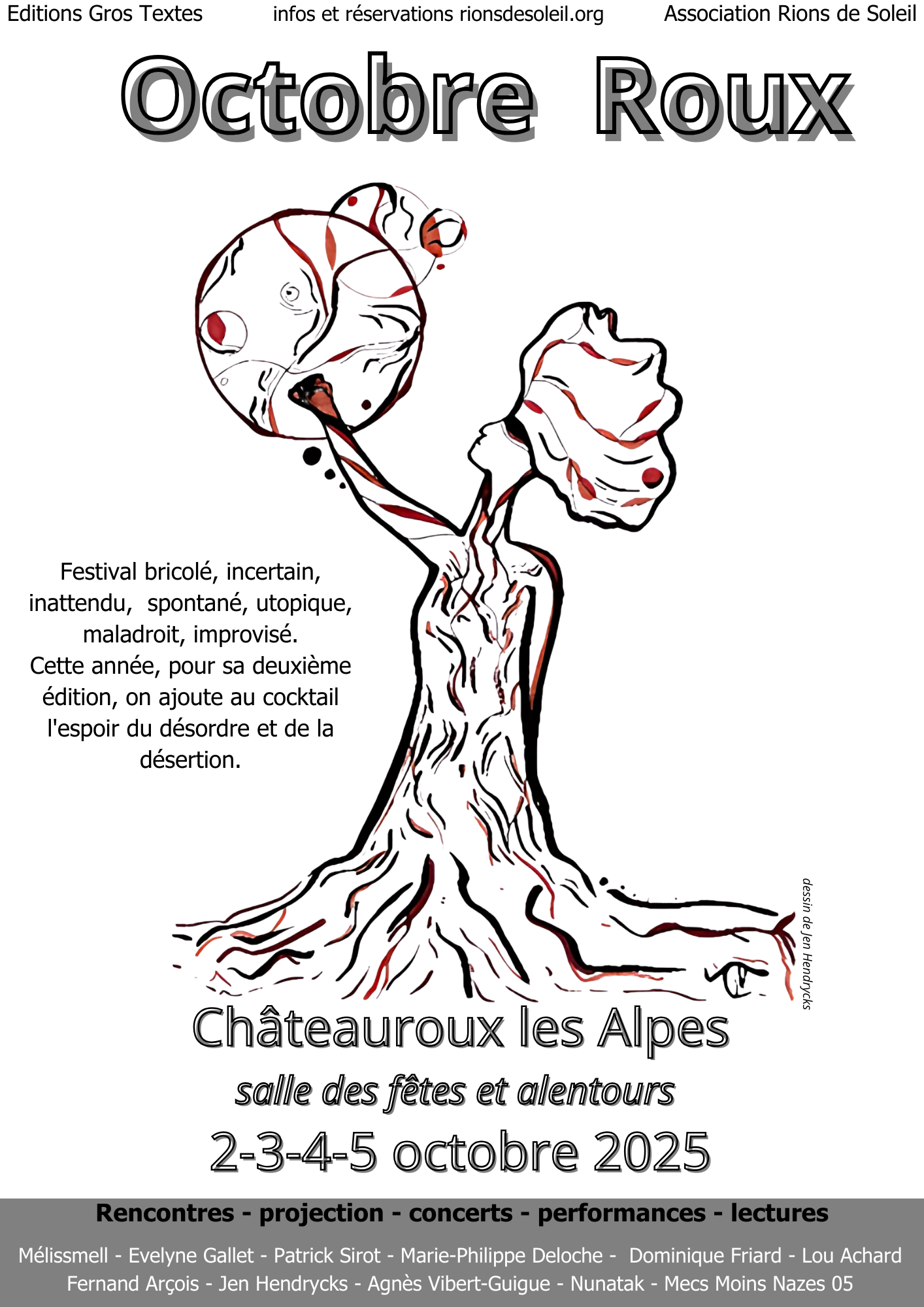 Octobre Roux, c’est quoi encore ce truc ? Octobre Roux, c’est cette tentative de coller ensemble l’art et le politique, de voir ce que ça donne quand on mélange de la poésie avec des analyses sociales, du documentaire avec des questions qui fâchent ou des utopies en marche, de la chanson avec de la colère. Octobre Roux, c’est un festival qui revendique toujours sa dose de bricolage, d’incertain, d’incohérent, d’inattendu, de spontané, d’utopique, de maladroit, d’improvisé, et cette année, pour sa deuxième édition, on ajoute au cocktail, l’espoir du désordre et de la désertion. Pas la fuite, non – plutôt la vacance ou bien le refus organisé, avec par exemple le récit de ces déserteurs, jeunes diplômés qui disent « non merci » à leur place de cadre, qui refusent d’endosser le costume du dominant, du sachant qui sait mieux que les autres ce qui est bon pour nous. Cette boule au ventre qu’ils décrivent, on la connaît tous : c’est le moment où tu réalises que le monde dans lequel tu vis te demande de participer à sa propre destruction et à la tienne. On causera aussi d’écritures soignantes, de ces mots qui peuvent faire autre chose que reproduire la violence ambiante, qui peuvent tisser, réparer, accueillir ce qu’on appelle les « restes » – tout ce que le système jette parce que ça ne rapporte pas, on parlera du féminisme de terrain, du féminisme vu par les hommes avec le collectif Mecs Moins Nazes, des féminicides qui ne diminuent pas et dont la poétesse, Jen Hendricks scande la mesure, des voix multiples qui se répondent, qui s’entremêlent, qui créent du commun ou n’y parviennent pas. Nous rejoindrons en soirées la voix puissante et prodigieuse de Melissmell, celle drôle, subversive et sensible d’Evelyne Gallet ou encore le délire insolite du poète performeur Patrick Sirot…
