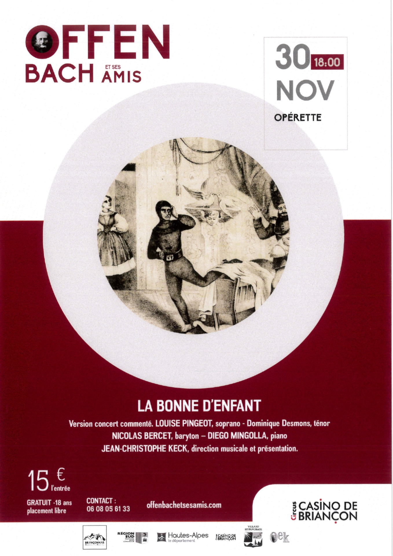 Le premier opus de la saison, propose une oeuvre tout aussi loufoque que charmante : La bonne d’enfant. Opérette en 1 acte de Jacques Offenbach. Version concert commenté. Louise Pingeot, soprano Dominique Desmons,ténor Nicolas Bercet, baryton Diego Mingolla, piano Jean-Christophe Keck, direction musicale et présentation Qui sera donc l’amant choisi par la bonne d’enfant Dorothée ? Le sapeur Mitouflard, ou bien le fumiste Gargaillou ? Le choix ne se fera pas sans mal… Une opérette des plus cocasses d’où jaillissent des flots de mélodies et d’éclats de rire.