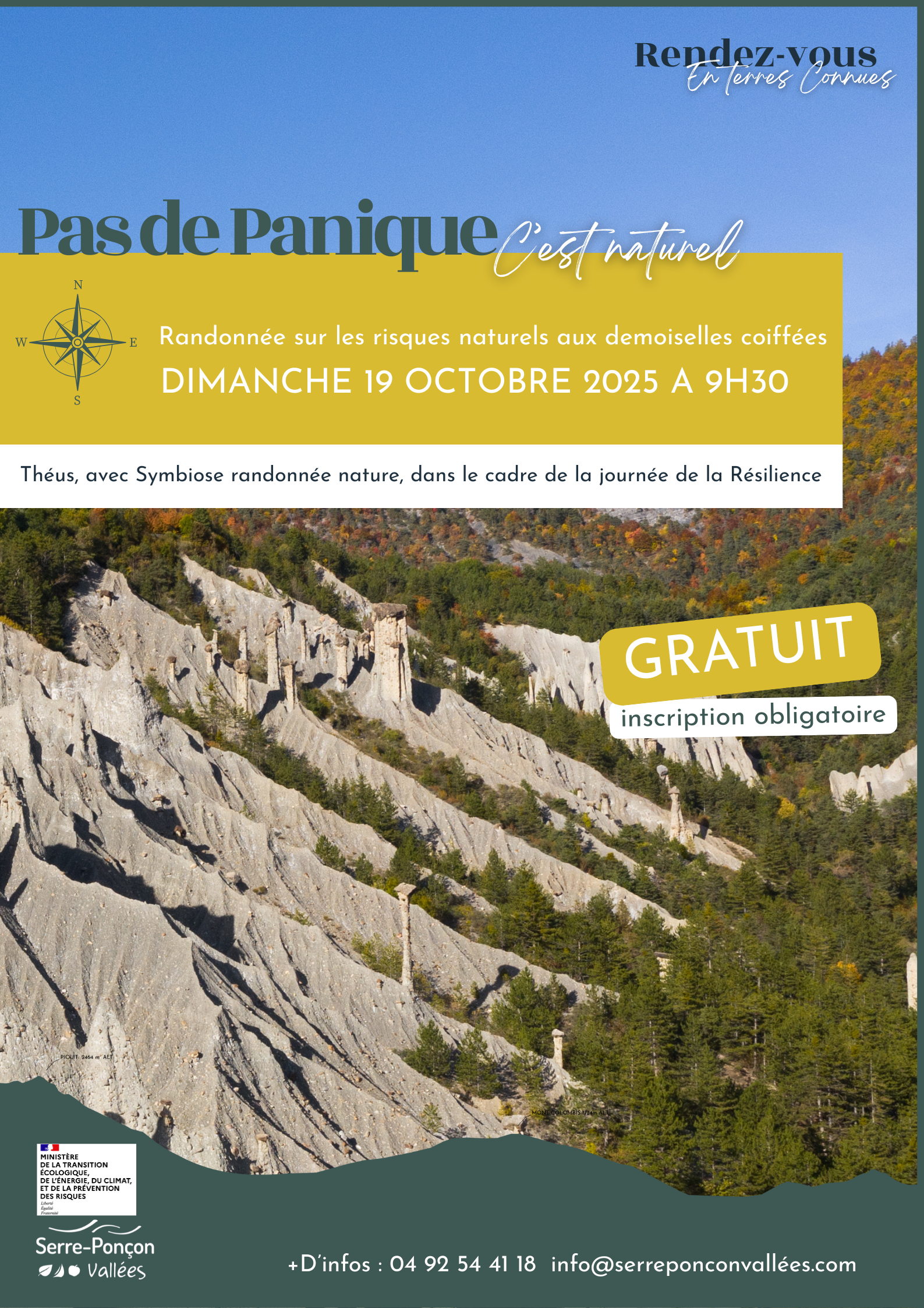 À l’occasion de la Journée de la Résilience, la Communauté de Communes Serre-Ponçon Val d’Avance, en partenariat avec Symbiose Randonnée Nature et Joëlanne Rhode, vous invite à une randonnée thématique autour des risques naturels en montagne. Au fil du sentier, elle vous guidera avec passion et pédagogie pour décrypter le paysage et mieux comprendre les forces qui le façonnent : géologie, hydrologie, aménagements humains… Vous apprendrez à lire la montagne, à retracer son histoire et à découvrir comment les hommes s’y sont adaptés, dans un environnement parfois imprévisible. Randonnée journée au milieu des demoiselles coiffées. Pause pique. inscription obligatoire. Dénivelé positif : 456 D+ Distance : 6km En boucle Temps de marche estimé 3h30 Durée de la sortie 5h environ Difficulté : intermédiaire Matériel à prévoir : Chaussures de randonnée ou baskets Sac à dos Pique nique Eau (1L à 1,5L par personne) Lunettes de soleil Crème solaire Chapeau/casquette Une paire de bâtons de marche est conseillé Barre de céréales ou snacking Médicaments personnels (diabète, asthme, allergies…) Conditions Enfants à partir de 10 ans. Rendez vous à 9h au lieu de rendez-vous. Pensez au covoiturage ! Le repas du midi n’est pas compris dans cette demi-journée. L’encadrant se réserve le droit de modifier ou d’annuler la randonnée en fonction des conditions météorologiques, du terrain ou des participants. Ce programme est indicatif, il peut être modifié par votre AMM pour s’adapter aux conditions météorologiques