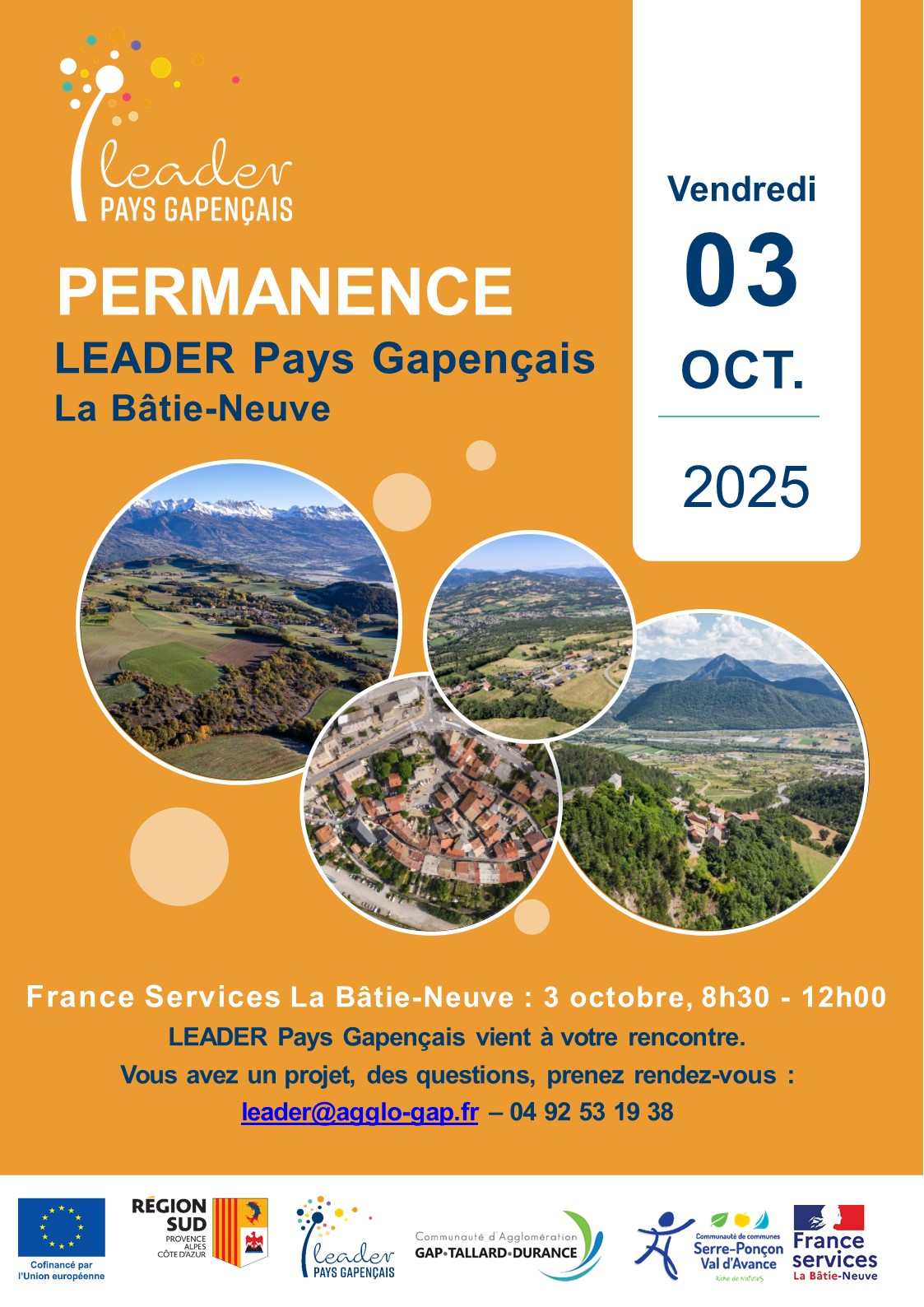 Vous avez un projet en tête, vous voulez vous renseigner sur un financement éventuel ou vous êtes simplement curieux… ? Sur rendez-vous à : leader@agglo-gap.fr et 04 92 53 24 52 Economie, Artisanat, Culture, Mobilité, Agriculture, Alimentation, Services, Solidarité, Environnement, Tourisme durable, Loisirs… LEADER soutient des projets innovants portés par des acteurs locaux, en faveur du développement rural. Pour la période 2023 – 2027, c’est une enveloppe de 1.8 millions d’euros qui est déployée pour soutenir des initiatives innovantes ! Cofinancé par le FEADER (Fonds Européen Agricole pour le Développement Rural) et des financeurs locaux, dont la Région SUD Provence-Alpes-Côte d’Azur principalement, le dispositif agit au plus proche du territoire, grâce notamment à un accompagnement de proximité dédié aux porteurs de projets.