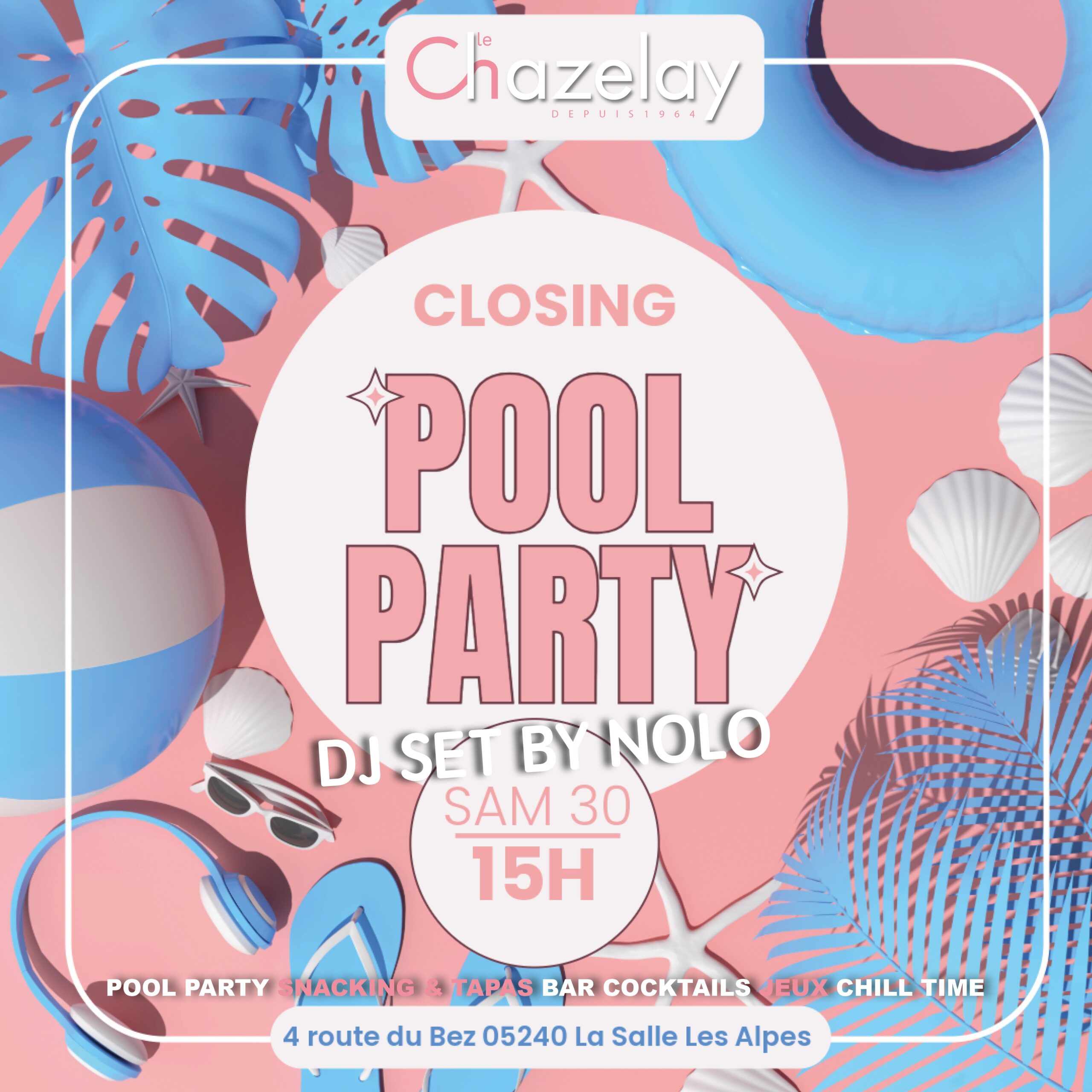 Détendez-vous au bord de la piscine, savourez des boissons et cocktails frais préparés par notre bar, et régalez-vous avec un délicieux assortiment de snacking et tapas. Ambiance chill, bonne musique et farniente pour profiter un max de notre dernier week-end d’ouverture estivale. Ne manquez pas cette fête parfaite pour s’amuser avec un dernier goût d’été ! L’été au Chazelay, profitez de 440m2 de RESTO, 200m2 de piscine, 1400m2 d’espace paysagé ! Une plage privée à la montagne dans un petit écrin de végétation, l’adresse originale et branchée de Serre Chevalier ! Pour cette dernière Pool, on retrouve DJ Nolo, qui illumine le Chazelay en journée et en soirée ! Plongez dans son univers électronique inspiré et captivant, il vous enflammera pour cette après-midi d’été ! Nolo incarne la quintessence de la passion électronique, des racines familiales à la diversité des genres explorés. Son passage à la tech house et à la techno, avec l’usage ingénieux des contrôleurs numériques, fait de lui un DJ polyvalent, résolument engagé dans l’évolution constante de la scène électronique. Entrée espace bar/resto gratuit Accès espace piscine surveillée payant Bar & Cocktails Snacking & Tapas Parking Gratuit – Pensez à désigner un SAM pour rentrer en toute sécurité
