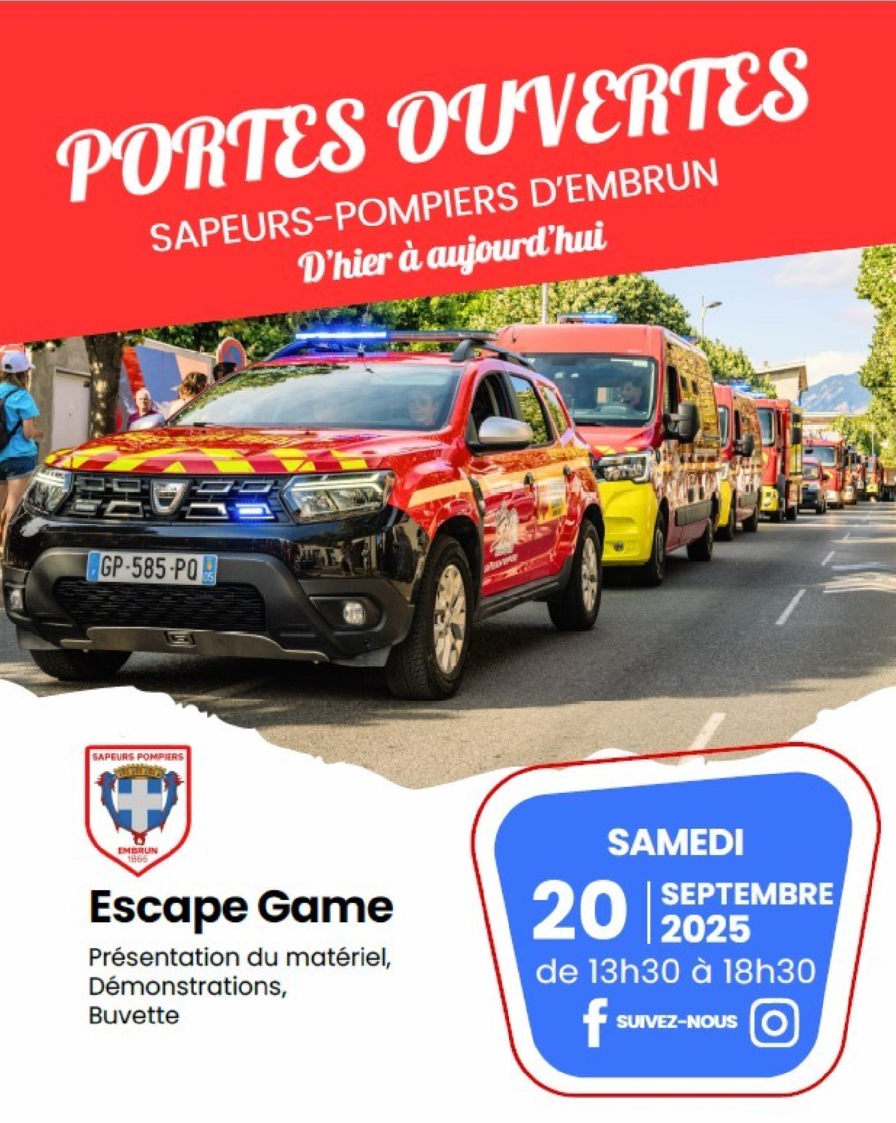 ESCAPE Game sur le thème des pompiers Ateliers les gestes qui sauvent Petit parcours sportif Présentation de la réalité virtuelle Ateliers divers sur les sapeurs-pompiers (BNSSA, SAV, Handicap Fire Tour, Secours à personne, service de santé, secours routiers, feux de foret, incendie urbain. Démonstrations par les jeunes sapeurs-pompiers. Buvette et vente de crêpes