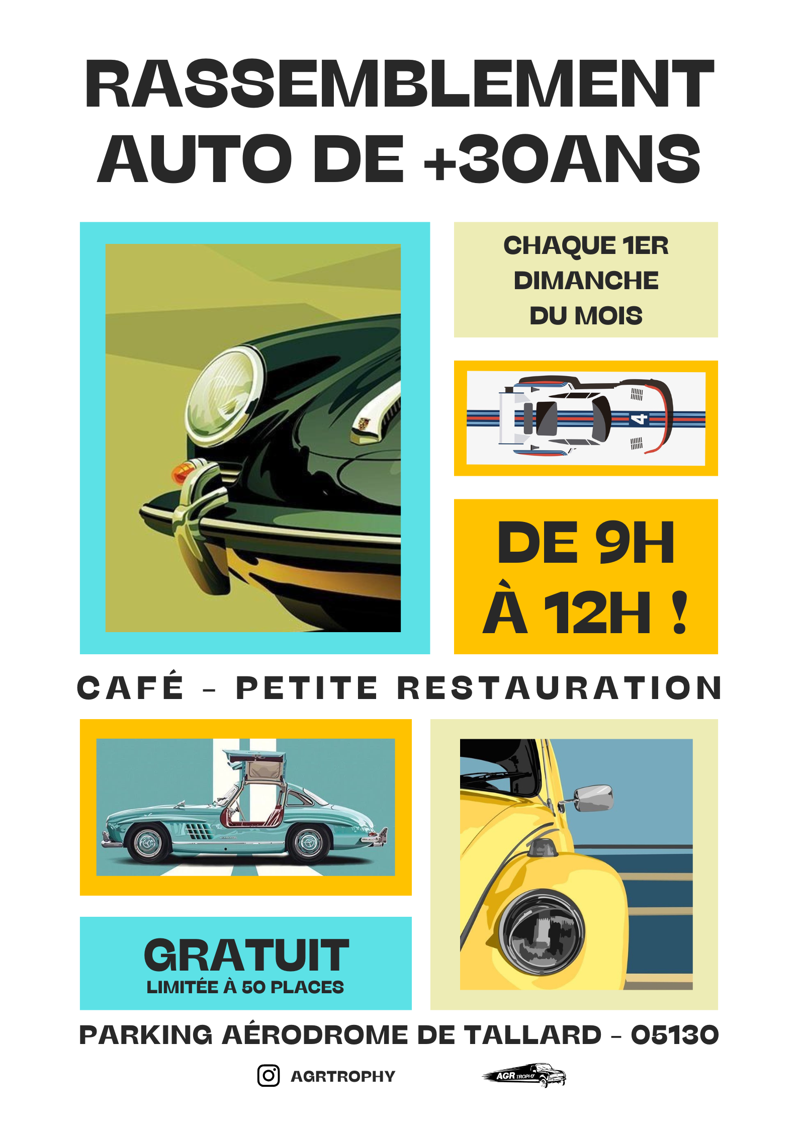 J’ai le plaisir de vous rencontrer chaque 1er dimanche du mois à l’aérodrome de Tallard pour échanger entre passionnés autour de nos petits bijoux sur roues. Je vous accueille de 9h à midi et vous offrirais volontiers cafés et petite restauration pour se réchauffer et discuter ensemble. Tout est gratuit, vous avez juste à venir avec votre petit bolide. Tout autre publique est bien entendu libre de venir admirer de belles mécaniques. Le parking est limitée à 40/50 places, si celui est complet, merci de vous garer au parking d’Intermarché. En espérant vous voir nombreux, je vous attend avec impatience.