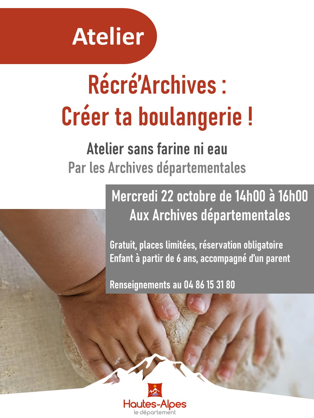 Devenez boulanger le temps d’un atelier ! Imaginer votre propre boulangerie : nom, menu, et la spécialité boulangère. Puis, place à la création avec de la pâte autodurcissante pour façonner votre pain ou votre création fantaisiste. Un atelier ludique pour stimuler imagination et créativité, sans cuisson ni farine. Cet après-midi sera suivi d’un goûter offert pour tous les apprentis boulangers.