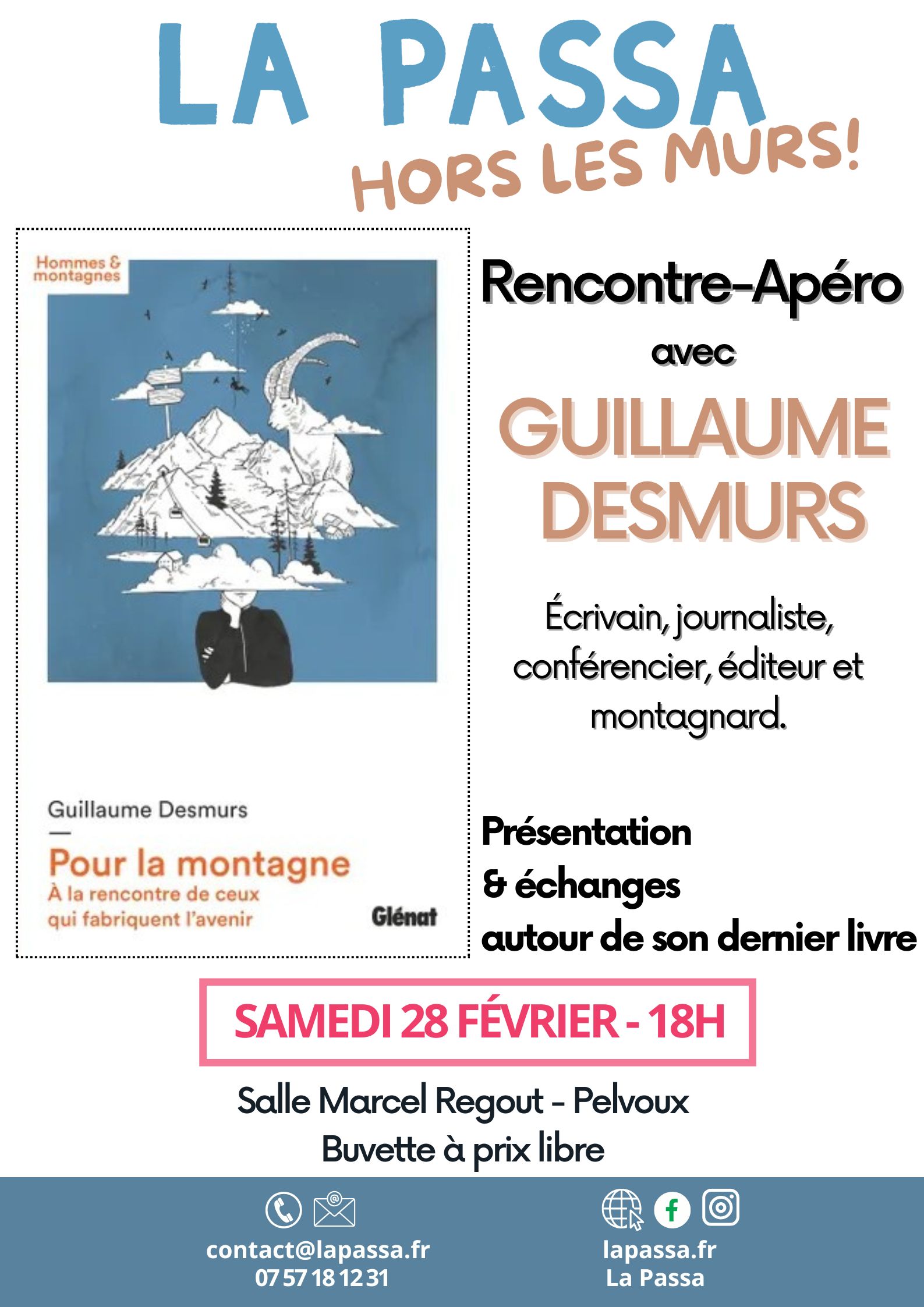 Écrivain, journaliste, conférencier, éditeur et montagnard, Guillaume Desmurs a de multiples casquettes. Lors d’une rencontre-apéro le samedi 28 février, il viendra nous présenter son dernier livre “Pour la Montagne – A la rencontre de ceux qui fabriquent l’avenir”. – – Présentation de l’ouvrage par l’éditeur (Glénat) : « Qu’est-ce qu’il faut faire alors ? » La question revient sans cesse face aux enjeux sociaux, économiques, climatiques et environnementaux auxquels sont confrontés les territoires de montagne. La réponse est autour de nous… et dans ce livre. Car la reconversion, inévitable, s’élabore d’ores et déjà entre les mains d’une éleveuse, d’un technicien municipal, d’un restaurateur, d’un géographe, d’une écrivaine, d’une militante, d’un élu, etc. Un travail discret, remarquable et patient de dizaines d’acteurs comme autant de reflets de la montagne de demain qui s’invente. À travers une douzaine d’interviews, ces acteurs invitent à s’enthousiasmer et à travailler dès aujourd’hui à une montagne vivante, qui ne dépend plus de la rente immobilière touristique des sports d’hiver. Guillaume Desmurs donne de la voix à ceux qui déplacent, jour après jour, des montagnes pour la transformer. Ils racontent leurs défis, leurs convictions, leurs difficultés, leur enthousiasme et leur amour de ce territoire aux avant-postes du changement climatique. Les germes d’avenir sont là !