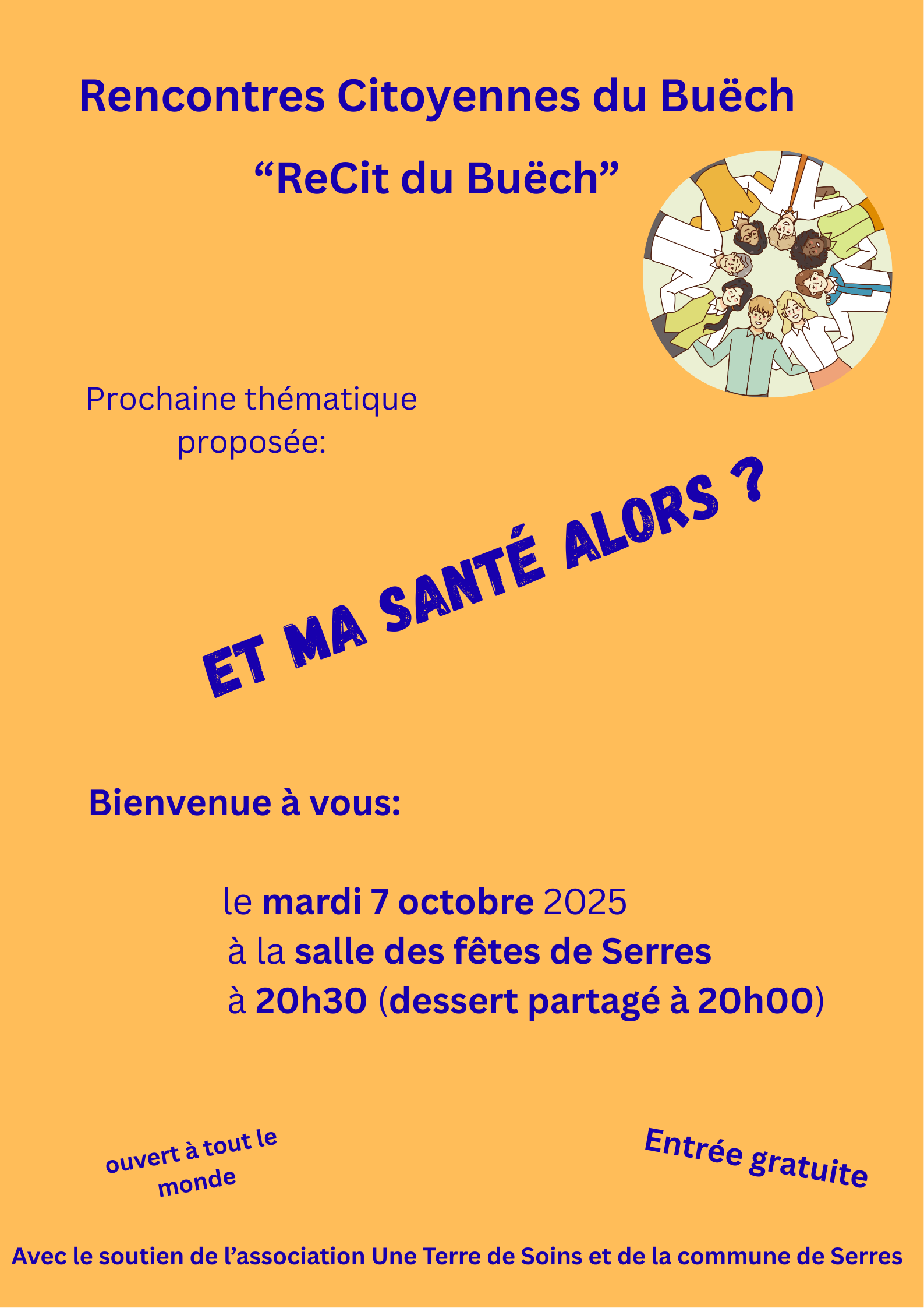 Venez vous pencher sur des sujets qui nous concernent toutes et tous pour porter un regard pluriel sur la réalité de notre territoire, nourrir une réflexion et ensemble, envisager des pistes de réponses. L’intérêt ? Rompre l’isolement face à des difficultés, prendre conscience d’autres façons de voir les choses, transmettre des connaissances ou compétences, construire un récit partagé et nourrir un contexte favorable à la recherche de solutions collectives. 4 à 6 rencontres par an sur différentes thématiques. Cette initiative, apolitique et apartisanne, peut prendre naissance grâce au soutien de la commune de Serres et de l’association Une Terre de Soins. Les rencontres sont ouvertes à tout le monde et gratuites.