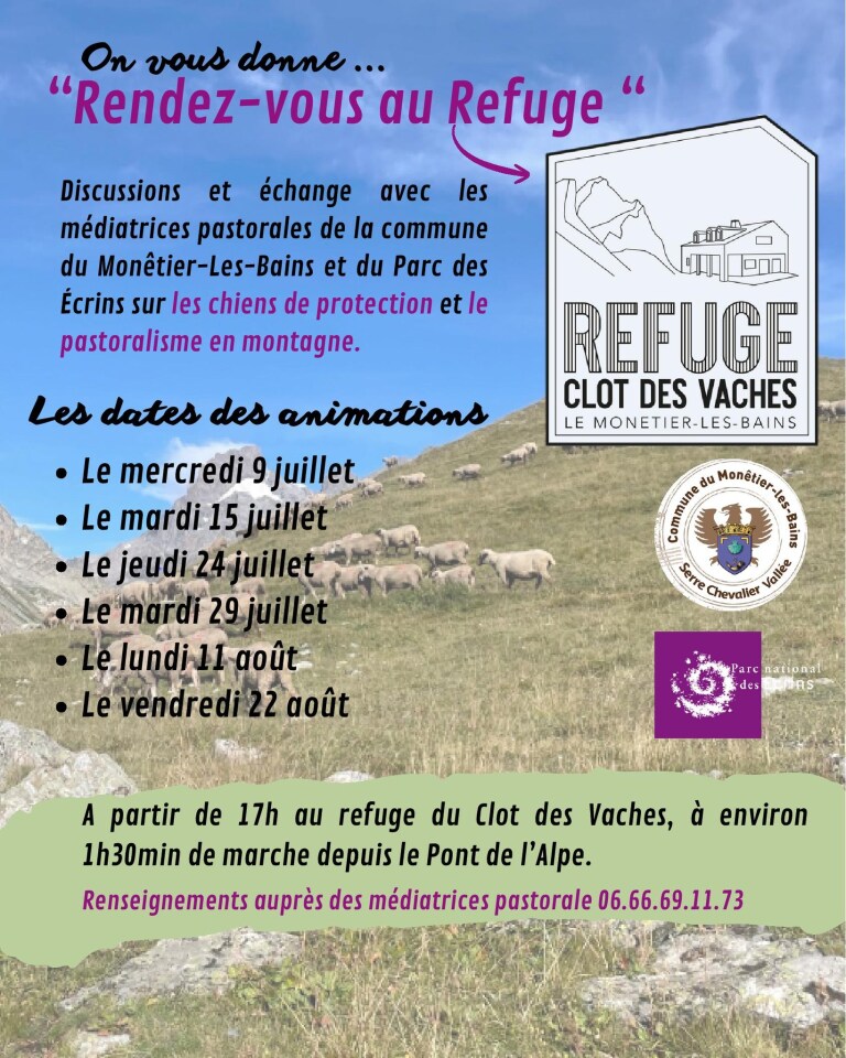 Discussions et échange avec les médiatrices pastorales de la commune du Monêtier-les-Bains et du Parc des Ecrins sur les chiens de protection et le pastoralisme en montagne.