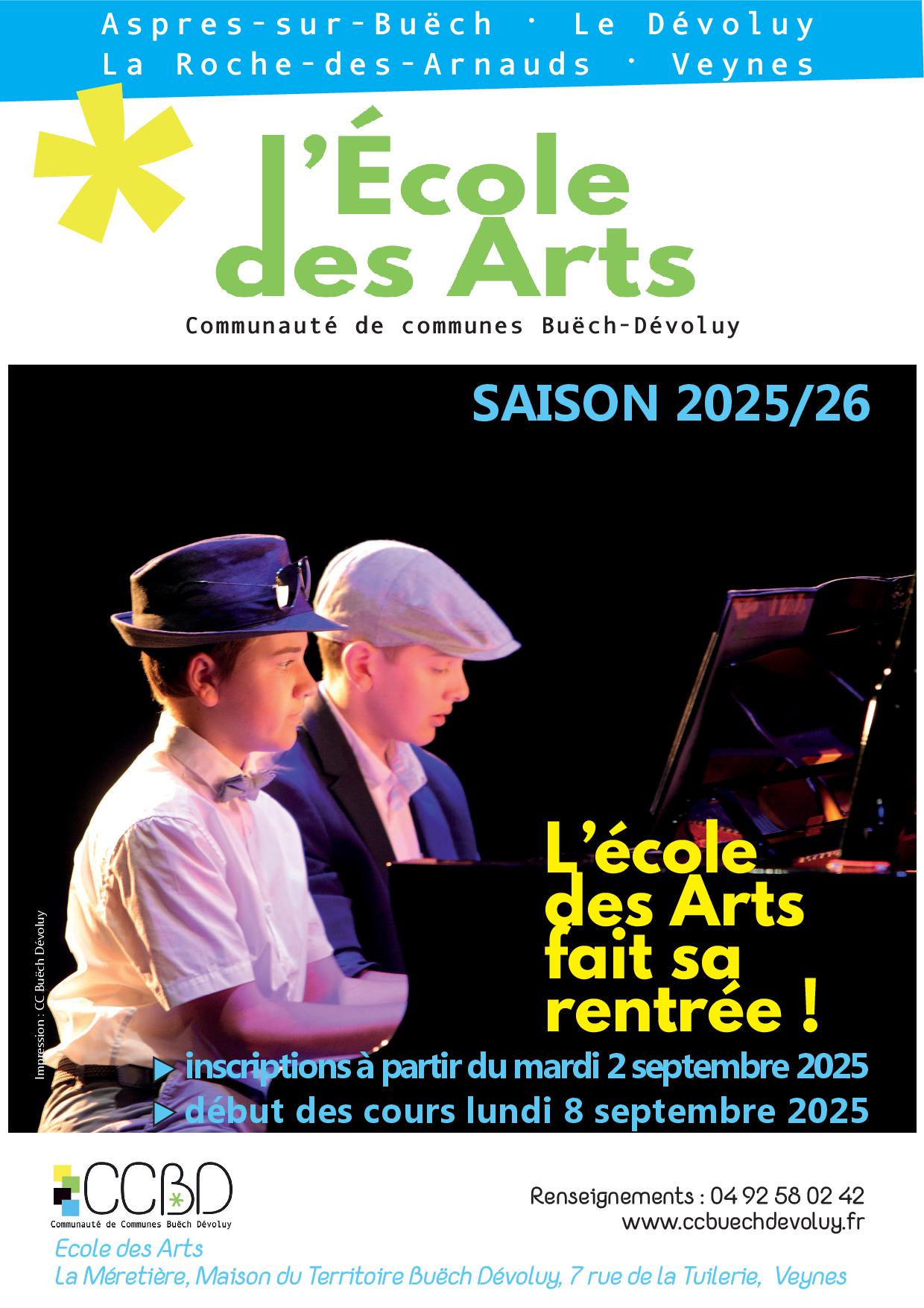 Les inscriptions à l’école des arts auront lieu à partir du mardi 2 septembre Les cours débuteront le lundi 8 septembre. De nombreuses disciplines sur 4 antennes du territoire (Aspres-Sur-Buëch, La Roche-des-Arnauds, Le Dévoluy et Veynes) de la Communauté de communes Buëch-Dévoluy sont proposées aux enfants et adultes désirant pratiquer un instrument, chanter ou s’initier au théâtre. Les élèves bénéficient d’un cours individuel – Accordéon, Batterie, Guitare Classique et Musique Actuelle, Piano, Saxophone, Violon et Chant- et d’un cours collectif. Ateliers de Musiques Actuelles, de Musique Traditionnelle, de Jazz, Chant Choral, Percussions et Théâtre viennent compléter l’enseignement hebdomadaire. Le jardin musical permet aux tout-petits de 4 à 6 ans de découvrir l’univers sonore des instruments, de la voix à travers l’écoute, le rythme, les jeux musicaux. Grâce à un partenariat avec l’Education Nationale, un professeur spécialisé dans les interventions en milieu scolaire apporte une aide technique à la réalisation de projets musicaux au sein des écoles primaires et maternelles du territoire.