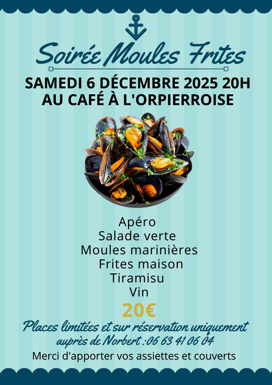 Menu : apéro, salade verte, moules marinières et frites maison, tiramisu, vin.