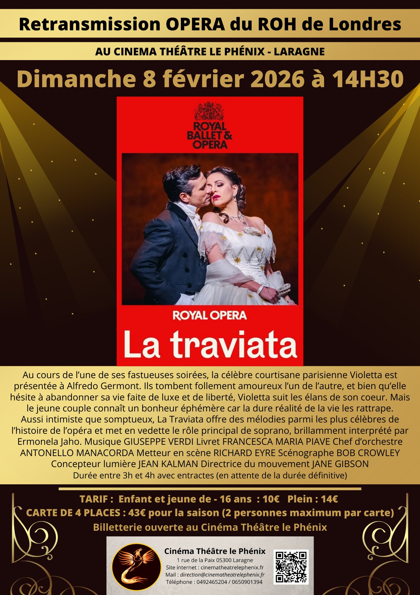 Au cours de l’une de ses fastueuses soirées, la célèbre courtisane parisienne Violetta est présentée à Alfredo Germont. Ils tombent follement amoureux l’un de l’autre, et bien qu’elle hésite à abandonner sa vie faite de luxe et de liberté, Violetta suit les élans de son cœur. Mais le jeune couple connaît un bonheur éphémère car la dure réalité de la vie les rattrape. Aussi intimiste que somptueux, La traviata offre des mélodies parmi les plus célèbres de l’histoire de l’opéra et met en vedette le rôle principal de soprano, brillamment interprété par Ermonela Jaho. Opéra en Italien avec des sous titres en Français