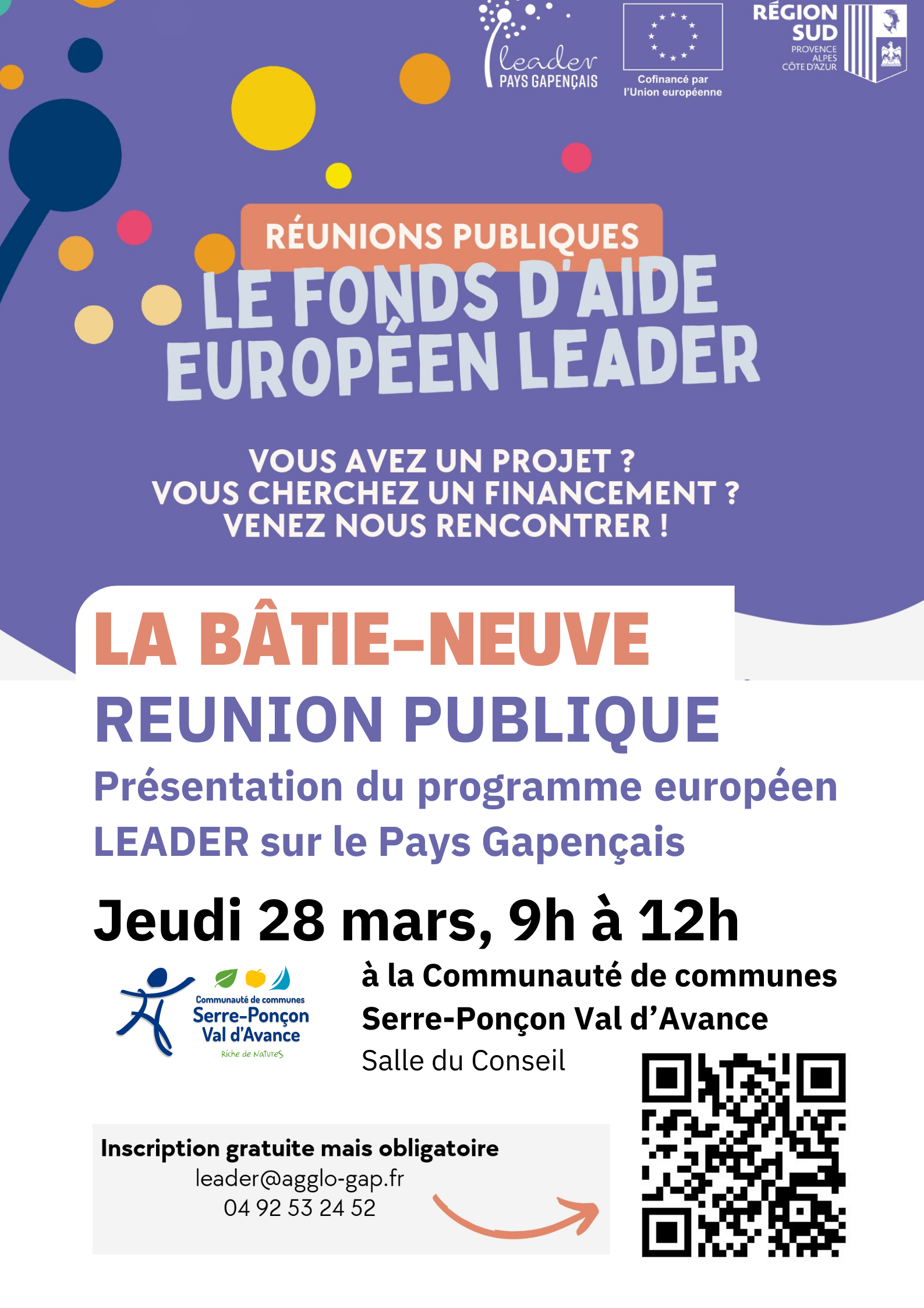 Jeudi 28 mars à La Bâtie-Neuve, de 9h à 12h, à la CCSPVA, SALLE DU CONSEIL. Economie, Artisanat, Culture, Mobilité, Agriculture, Alimentation, Services, Solidarité, Environnement, Tourisme durable, Loisirs…LEADER soutient des projets innovants portés par des acteurs locaux, en faveur du développement rural. Pour la période 2023 – 2027, c’est une enveloppe de 1.8 millions d’euros qui sera déployée pour vous aider à donner vie à vos idées. Le Pays Gapençais organise, du 6 mars au 4 avril, 10 réunions publiques ouvertes à tous pour venir à votre rencontre, vous expliquer comment bénéficier de cette aide et pour vous présenter les projets déjà financés proche de chez vous ! Ces réunions, d’une durée de 3h, nous permettront de vous présenter le fonctionnement du fonds d’aide européen LEADER, de vous proposer des témoignages de porteurs de projets de votre territoire et enfin d’échanger ensemble autour d’un moment convivial. Ces réunions sont ouvertes à tous : vous avez un projet en tête, vous voulez vous renseigner sur un financement éventuel ou vous êtes simplement curieux… Venez nous rencontrer ! ———- Evènement gratuit sur inscription obligatoire en ligne sur Retrouvez toutes les informations sur www.gap-tallard-durance.fr, onglet LEADER. Vous rencontrez des difficultés pour vous inscrire, contactez leader@agglo-gap.fr ou au 04 92 53 24 52