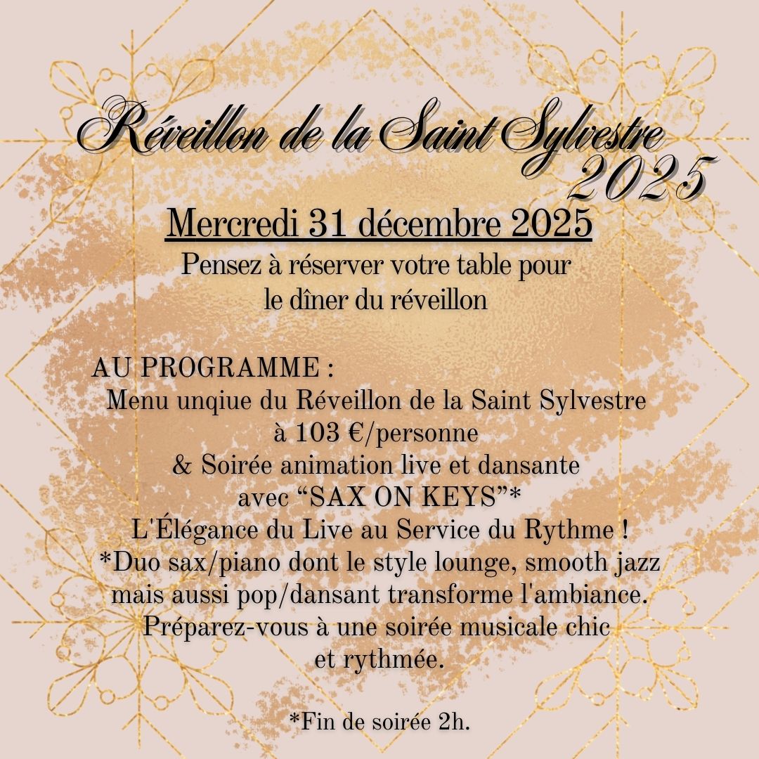 Vivez une soirée musicale chic et entraînante avec le duo sax/piano “SAX ON KEYS”, qui vous fera voyager du lounge et smooth jazz à des rythmes pop et dansants. Préparez-vous à célébrer la Saint-Sylvestre dans une ambiance élégante et festive. Fin de soirée à 2h.